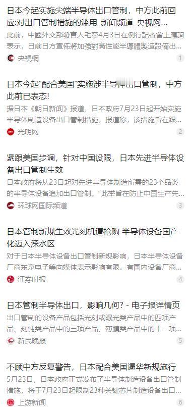 让中国的光刻机“变废铁”,日本对华下狠手,外媒:比美国人还绝 麻烦看官老爷们右上角点击一下“关注”,既方便您进行讨论和分享,又能给您带来不一样的参与感,感谢您的支持! 全球半导体产业的博弈持续升级,日本在芯片设备领域的对华限制,成为影响产业链格局的关键动作。这场由美国牵头、日本跟进的技术封锁,试图从源头卡住中国芯片发展的咽喉,却在实施后走向了与初衷相悖的结局。 2023 年 7 月 23 日,日本经济产业省正式施行修订后的《外汇及外国贸易法》省令,对 23 类尖端半导体制造设备实施对华出口管制。这一举措未直接点名中国,却明确针对先进制程芯片生产所需的核心装备,是日本配合美国遏制中国芯片产业的重要一步。 此次管制覆盖光刻、刻蚀、薄膜沉积、清洗、检测等芯片制造核心环节,并非简单禁止出口,而是要求所有相关设备对华出口必须逐件申请审批。这种模糊且严苛的流程,人为制造供应不确定性,直接干扰中国芯片产线的稳定运行与扩产规划。 新规落地后,日本半导体设备对华出口结构明显调整,先进制程相关设备出口量大幅下滑。东京电子、爱德万、Screen 等日本头部设备企业,因失去中国这一全球最大半导体设备市场,营收与利润受到明显冲击,长期积累的产业优势开始松动。 面对外部技术封锁,中国没有被动妥协,而是采取一系列务实反制与自主发展措施。中国先后对钨、钼、铟、稀土等半导体关键原材料实施规范出口管制,守住产业链上游主动权,同时以政策与资源倾斜,全力推动半导体设备国产替代。 过去两年,国内设备企业在刻蚀、薄膜、清洗等领域接连实现技术突破,产品性能逐步满足产线需求。中国半导体设备整体自给率从较低水平稳步提升,成熟制程设备配套能力显著增强,国产设备在产业链中的占比实现大幅增长。 日本的遏华政策不仅没能阻挡中国芯片产业前进的脚步,反而倒逼国内加快去依赖化进程,让更多资源流向自主研发领域。全球半导体产业由少数国家垄断的格局被逐步打破,多元化、自主化成为产业发展的新趋势。 从产业规律来看,技术封锁从来不是长久之计。日本为迎合美国战略牺牲自身商业利益,既伤害了中日长期形成的产业链合作关系,也让全球半导体供应链陷入不稳定状态,最终付出代价的还是本国企业与产业前景。 中国芯片产业在压力中完成蜕变,从被动应对到主动布局,用实际成果证明,核心技术是买不来、堵不住的。这场博弈还在继续,而自主创新与产业链安全,已经成为中国半导体产业不可逆转的发展方向。