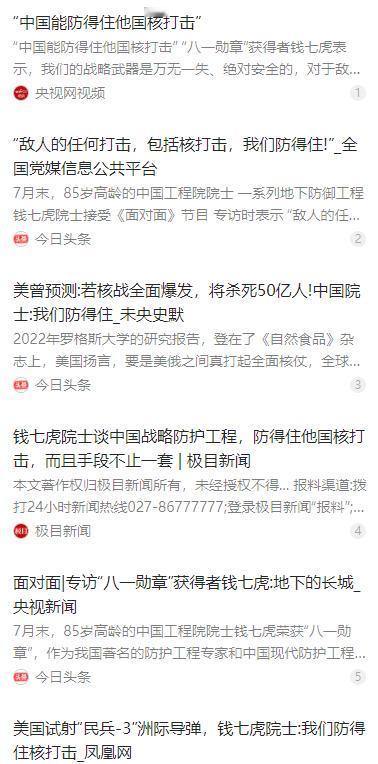 国外军事专家说,若美俄打起来,全球会有50亿人死亡。但如果美国和中国爆发核战情况如何?中国院士给全国人民吃了一颗定心丸。中国防得住,而且手段不止一套。 麻烦看官老爷们右上角点击一下“关注”,既方便您进行讨论和分享,又能给您带来不一样的参与感,感谢您的支持! 国际局势复杂多变,核武器带来的安全风险始终牵动着全球目光。不少国外军事专家与科研机构,都对大规模核冲突的后果做过推演。这些结论并非危言耸听,而是基于科学模型得出的严肃警示,也让很多人关心,如果大国之间爆发核冲突,世界会走向何方。 2022 年 8 月,国际权威学术期刊《自然・食品》刊登了一项重磅研究。美国罗格斯大学联合多家机构的科研团队,模拟了美俄全面核战的场景。研究显示,核爆炸产生的大量烟尘会遮蔽阳光,导致全球气温骤降,粮食系统彻底崩溃。 按照模型推算,这场冲突带来的直接伤亡之外,后续饥荒与环境灾难,会在数年间造成全球约 50 亿人死亡。这个数字相当于世界大部分人口,足以说明核战争没有赢家,一旦爆发,全人类都要承受难以想象的代价。 很多人由此联想到,如果冲突发生在其他大国之间,比如美国与中国,结果又会怎样。这样的假设让人不安,但也让民众更关心本国的安全防御能力,尤其是面对核威胁时,我们有没有足够的手段保护自己和家人。 就在同一时期,我国防护工程领域的权威专家钱七虎院士,公开发声给全国人民吃下一颗定心丸。2022 年 8 月,钱七虎院士在接受央视专访时明确表示,面对敌人的任何打击,包括核打击,我们都防得住,而且防御手段不止一套。 钱七虎并非普通专家,他是中国工程院院士、国家最高科学技术奖获得者、八一勋章获得者,更是我国现代防护工程理论的奠基人与学科创立者。他的表态,建立在几十年科研与工程实践之上,是专业、严谨、负责任的判断。 从上世纪 60 年代开始,钱七虎便投身国防防护领域。在长达数十年的时间里,他带领团队攻坚克难,从零搭建起中国现代防护工程技术体系。这一体系覆盖从战略指挥设施到重要民生目标的全方位防护,是国家安全的重要屏障。 他主导建设的一系列地下防御工程,被形象地称为地下钢铁长城。这些工程能够抵御包括核爆炸在内的高强度打击,有效保护我国战略力量与关键设施安全。正是这些看不见的工程,为国家应对极端威胁提供了坚实的底气。 随着技术发展,我国的安全防御能力早已不局限于单一防护。经过多年建设,我们已经形成集预警、防护、反击于一体的完整核安全体系,能够在威胁来临前及时发现,在打击到来时有效抵御,在必要时实施可靠反击。 与此同时,我国还在持续完善民生防护与应急保障网络。从城市人防工程到应急物资储备,从灾害预警机制到全民防护教育,全方位提升面对极端情况时的生存与保障能力,让防御成果真正惠及全体人民。 我国始终坚持自卫防御的核战略,郑重承诺不首先使用核武器,不对无核国家使用或威胁使用核武器。这一政策体现了大国责任与和平理念,也说明我们发展核力量,目的是防御、是威慑,而不是主动挑起冲突。 有人疑惑,防御能力再强,真的能抵挡核打击吗。钱七虎院士的回答很直接,我们的防护手段会随着威胁不断升级,始终保持可靠有效性。不管对方使用何种武器,我们都有能力保护国家与人民的根本安全。 从国际环境来看,近年来全球核军控体系面临挑战,部分国家加大核力量建设,地区冲突中也时常出现核言论。在这样的背景下,拥有可靠的防御能力,既是保护自己,也是维护地区与世界的战略稳定。 我国的核防御体系,不是为了争霸,而是为了止战。强大的防御能力,能够有效打消某些势力的军事冒险念头,让他们明白,对中国发动任何形式的攻击,都不可能得逞,反而会付出无法承受的代价。 钱七虎院士和无数国防科研工作者,用一生默默奉献,把安全防线筑在我们脚下。他们不追求名利,只愿国家安稳、人民平安。正是这些无名国士,让我们在复杂动荡的世界里,拥有稳稳的安全感。 对比国外研究描绘的惨烈场景,更能体会到中国防御能力的珍贵。我们不希望任何核冲突发生,但也绝不惧怕威胁。有成熟的技术体系、坚强的工程屏障、科学的战略指导,我们完全有能力守护家国安宁。 如今的中国,早已不是任人欺凌的时代。我们既有捍卫和平的诚意,也有保护自己的实力。从地下防护工程到天上预警雷达,从战略反击力量到民生防护网络,多重安全手段共同构筑起守护十四亿人的坚固盾牌。 面对未来的各种风险挑战,我们有足够底气从容应对。钱七虎院士的定心丸,背后是国家实力的支撑,是几代人的努力,是科学与工程的结晶。只要防御体系牢不可破,国家安全与人民安宁就有根本保障。