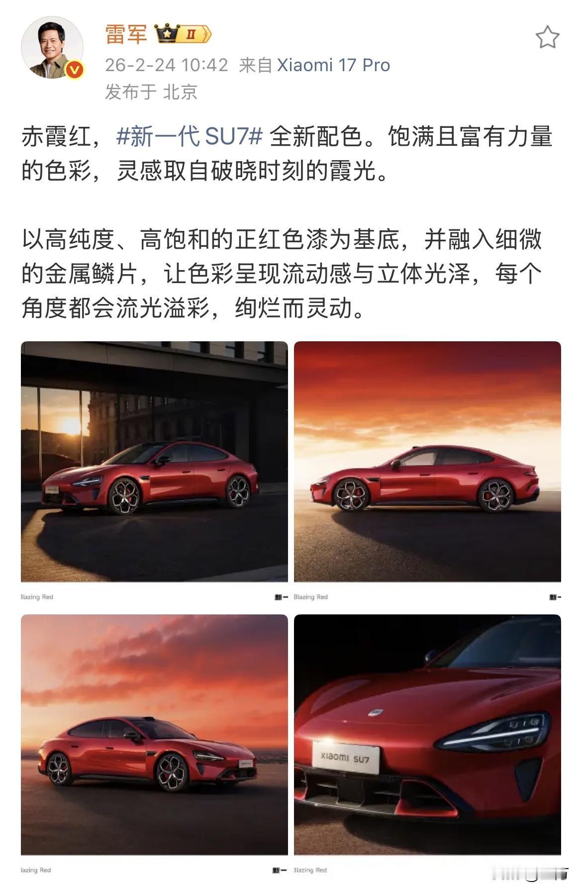 雷军带领高管团队开工! 就在刚才,雷军在社交网络连续更新了几条信息,与以往年不同的是,这次他带领12个小米团队的核心高管,站在他们全新的小米SU7前面,每个人身上挂着一个大大的红色围巾,一起竖起大拇指,就算是开工了! 所以这次他们的背景图就是全新一代的小米SU7,为了看起来与新年开工的气势比较贴切,他们把背景弄成了红色,这个主推的新车也弄成了红色,所以后面他又专门给大家介绍了几个红颜色的全新小米SU7。 他俩很多人更加关心的是小米的核心团队这12个高管,在这些高管当中,可能大多数网友只认识雷军、林斌卢伟斌和许斐,他们分管的业务决定了他们必须打造属于自己的个人IP,所以大家经常可以在网上看到他们的动态。 当然,剩下这八个人也是真正的核心,因为小米发展的每一个方向 和具体落实的一些细节部署,都有这八个人的具体负责。 不知道今年雷军他们还会不会像去年一样,给卢伟斌弄一个小米SU7的车模,毕竟去年他们的任务是提前完成的,今年能不能够超越去年,在一定程度上,可能取决于新小米SU7 ,以及SUV改进版,和小米大尺寸SUV。