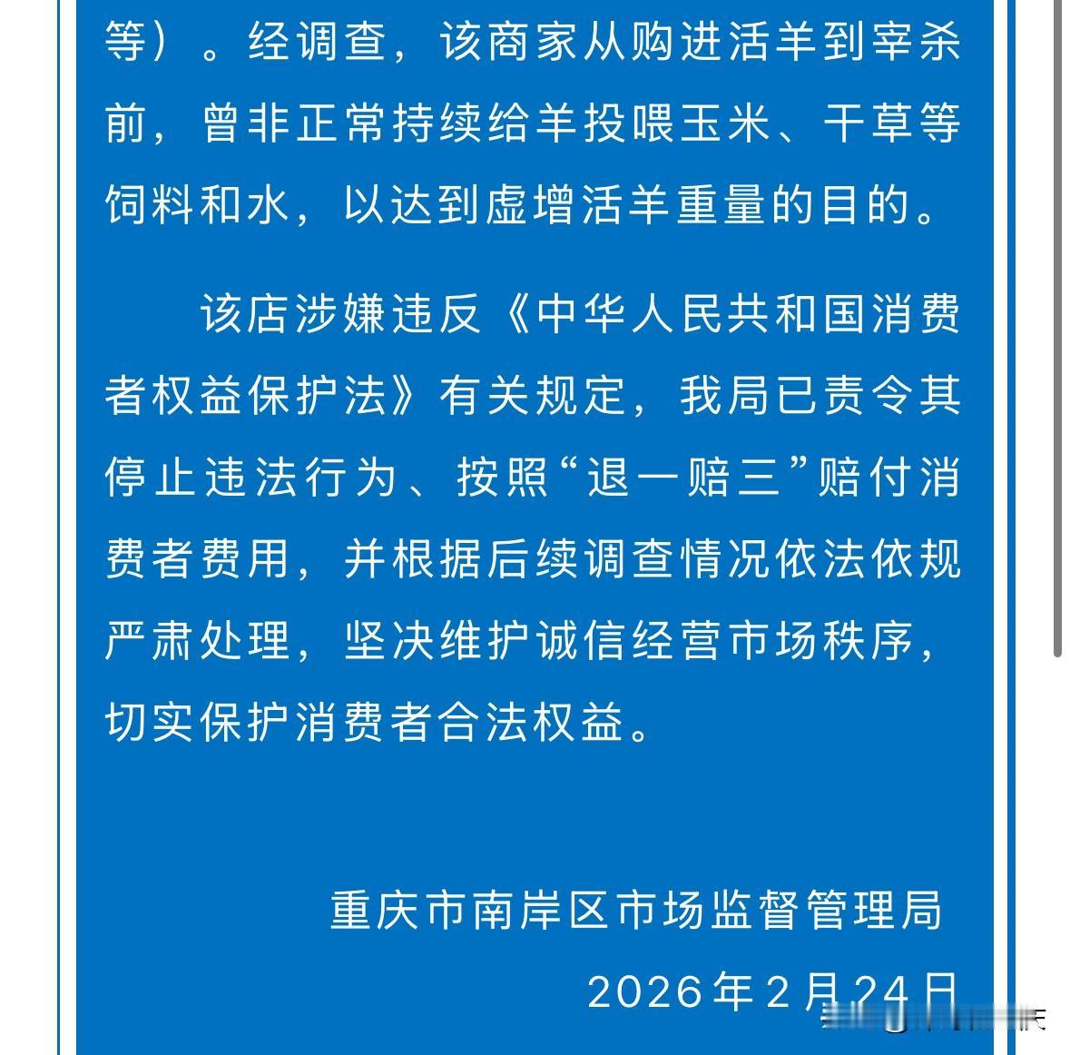 重庆通报“36斤活羊烤制完成后仅剩6.9斤”: 1、商家购进活羊后持续给羊投喂虚增活羊重量;2、退一赔三,赔付消费者;3、根据后续调查结果严肃处理!此事再度提醒广大商家:重庆是旅游热门城市,不要消耗游客的信任,开门迎客诚信为先,千万不要短视,扳起石头砸自己脚,信息爆炸时代,千万不要存在侥幸心理