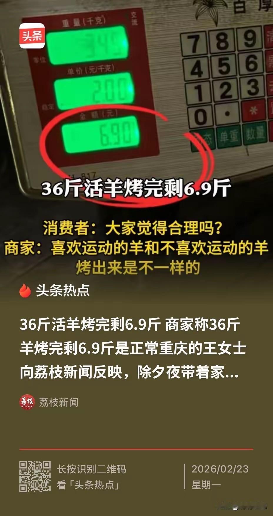 重庆,一女子除夕夜带着全家去吃烤全羊,活羊称重后足足有36斤,可是等烤熟端上来之后,女子看到几乎没什么肉,于是便质问起了老板要求复称,无果后女子选择了报警求助,结果复称后只有区区6.9斤,女子当即表示无法接受,可是老板却表示这很正常。 除夕夜本是阖家团圆、开开心心吃饭的日子,女子点烤全羊,图的就是分量足、吃得爽。商家当面称重、做标记,流程看着透明,谁料成品直接缩水八成。 行业常识摆在眼前,36斤活羊宰杀去杂后,正常能剩16到18斤带骨生肉。高温烤制再脱水去油,最终成品也该在10斤以上,6.9斤明显低于底线。 商家一句轻飘飘的“正常”,把消费欺诈包装成合理损耗。水分会蒸发,脂肪会融化,但绝不是偷梁换柱、缺斤短两的借口。 顾客现场确认的是36斤活羊,最终上桌却连7斤都不到,差距大到离谱。这种操作,已经不是手艺问题,而是良心问题。 民警到场才肯复称,足以说明商家心里有鬼。面对铁一般的数字,还拒不认错,这样的态度比分量缩水更让人寒心。 餐饮生意靠的是回头客,靠的是诚信经营。用这种手段坑骗顾客,看似多赚了一笔,实则砸了自己的招牌。 法律早已明确,故意缺斤短两属于消费欺诈,消费者有权要求退一赔三。任何套路,在法律面前都站不住脚。 过年吃饭吃的是心意,不是糟心。顾客愿意为食材、手艺、服务买单,绝不是为商家的黑心套路买单。 这种明目张胆的宰客行为,不仅伤害一位消费者,更破坏整个行业的信誉。监管部门就该严查严处,守住市场公平底线。 做生意先做人,食材可以缩水,良心不能缩水。别把顾客的信任,当成可以随意欺骗的软肋。 各位读者你们怎么看?欢迎在评论区讨论。
