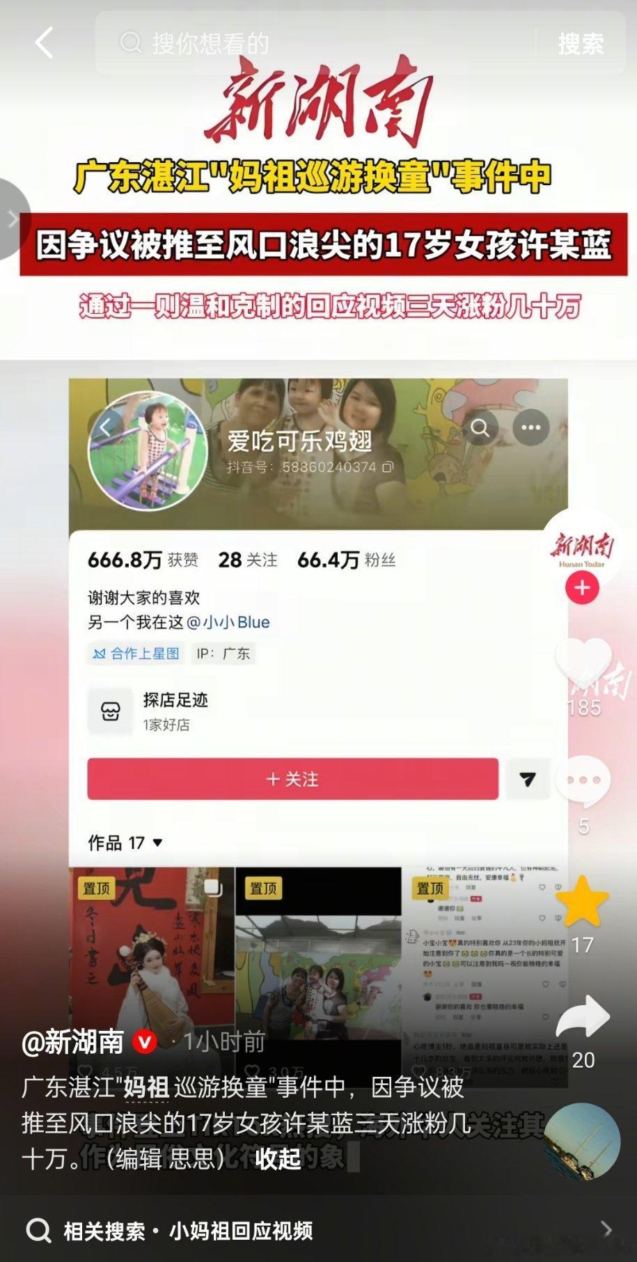 有媒体报道了,妈祖女孩的账号火了。“妈祖巡游换童事件”的风口浪尖。妈祖女孩发布视频,三天涨粉几十万。还登上了海外国际版的Tik Tok热搜。妈祖被换女孩三天涨粉几十万