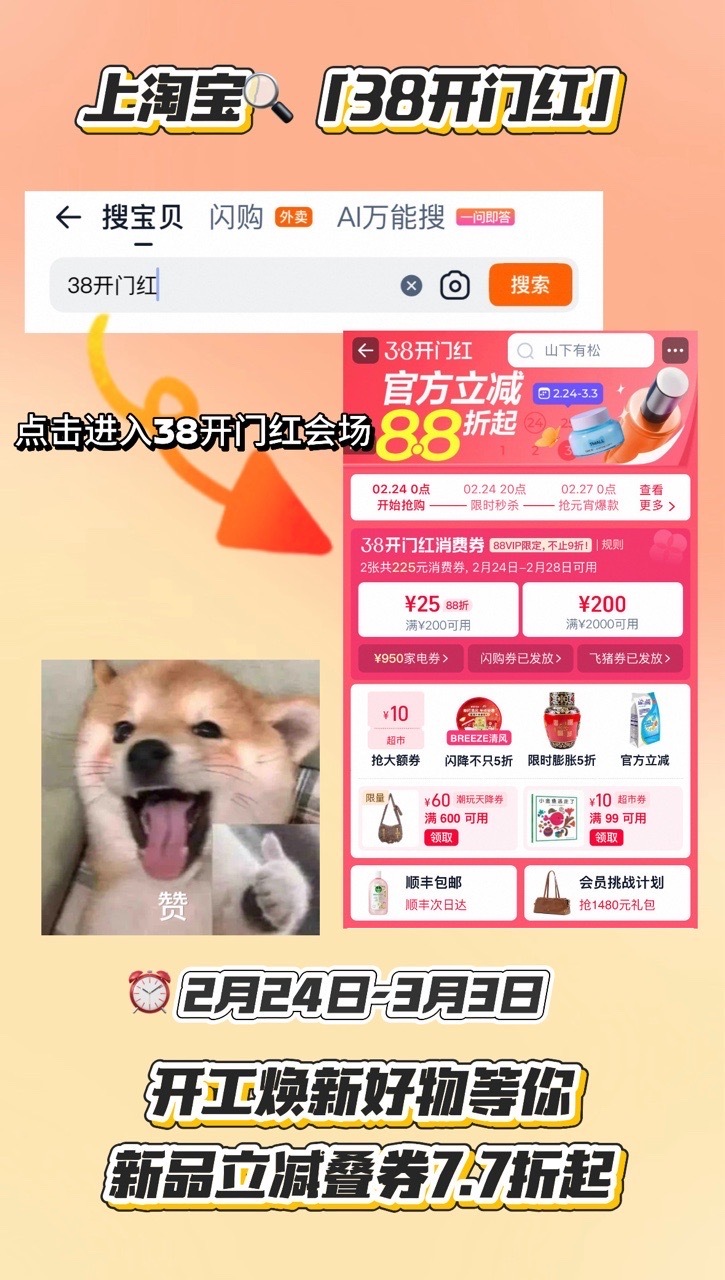天猫38迎新而上开工焕新好时机来啦!2月24日-3月3日,上淘宝搜【38开门红】,新品立减叠券7.7折起,超多好物一站购齐,开工状态直接拉满!开工新头好全都上淘宝