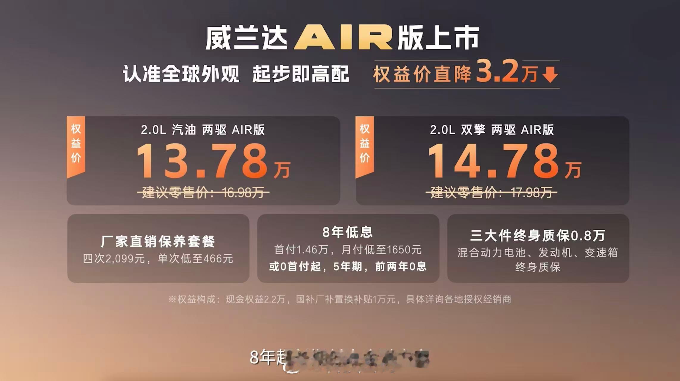 广汽丰田发布厂家直销保养套餐 厂家亲自下场兜底售后,这不仅是服务的升级,更是对行业“潜规则”的一次打破。广汽丰田此次推出的厂家直销保养套餐,以2099元4次,透明价格,全国600多家4S店通用,彻底解决了消费者担心的“门店搬迁、套餐作废”的后顾之忧。这种新模式让保养消费从此透明、标准化,推动售后市场迈向良性循环。当这份“兜底”诚意,叠加动力系统终身质保、8年超长期低息金融方案,以及威兰达AIR版“入门即高配”的产品力,13万级的威兰达AIR版作为家用SUV的含金量正肉眼可见地上升。从购车到用车,全周期无忧,这才是油车该有的价值感。
