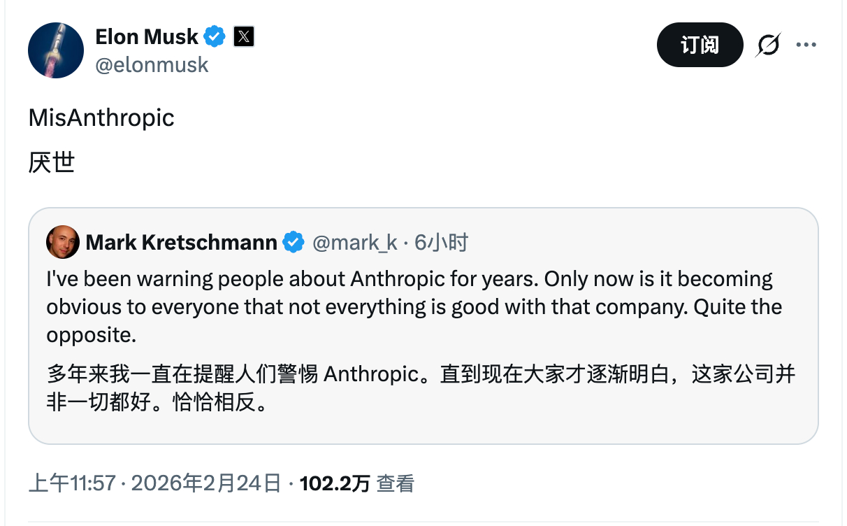 马斯克今天狂喷Anthropic,推上也几乎是一面倒的程度,开年就让我们看了一场好戏。