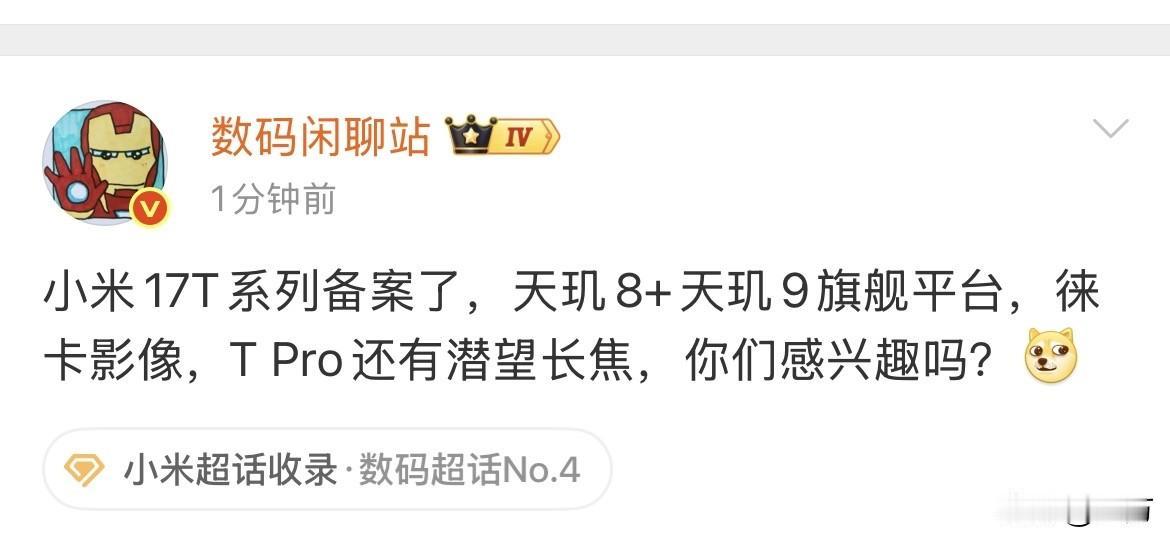 数码博主:小米17T系列备案了,天玑8+天玑9旗舰平台,徕卡影像,T Pro还有潜望长焦! 就在刚才,有数码博主爆出了小米17这个全新系列的备案,因为根据之前的惯例来说,小米T系列的,应该都是海外版本的,再加上这两个配置,和徕卡影像以及PRO版本的长焦,就能看出来,这个机器是想走出差笔别和性能化的路线。 当然有人想问,这个手机在海外卖多少钱,以及它与国内同类型的哪个品牌比较配置和定位接近,相对来说与K90的ultra系列差不多,只不过没有带徕卡,所以会在这个机子的基础上,性能和售价都会有提升。 只是不知道最终这个机子最终出来的时候,会不会都是海外专供版本,就要等到正式发售的时候,看样子也不是这段时间,我们拭目以待。