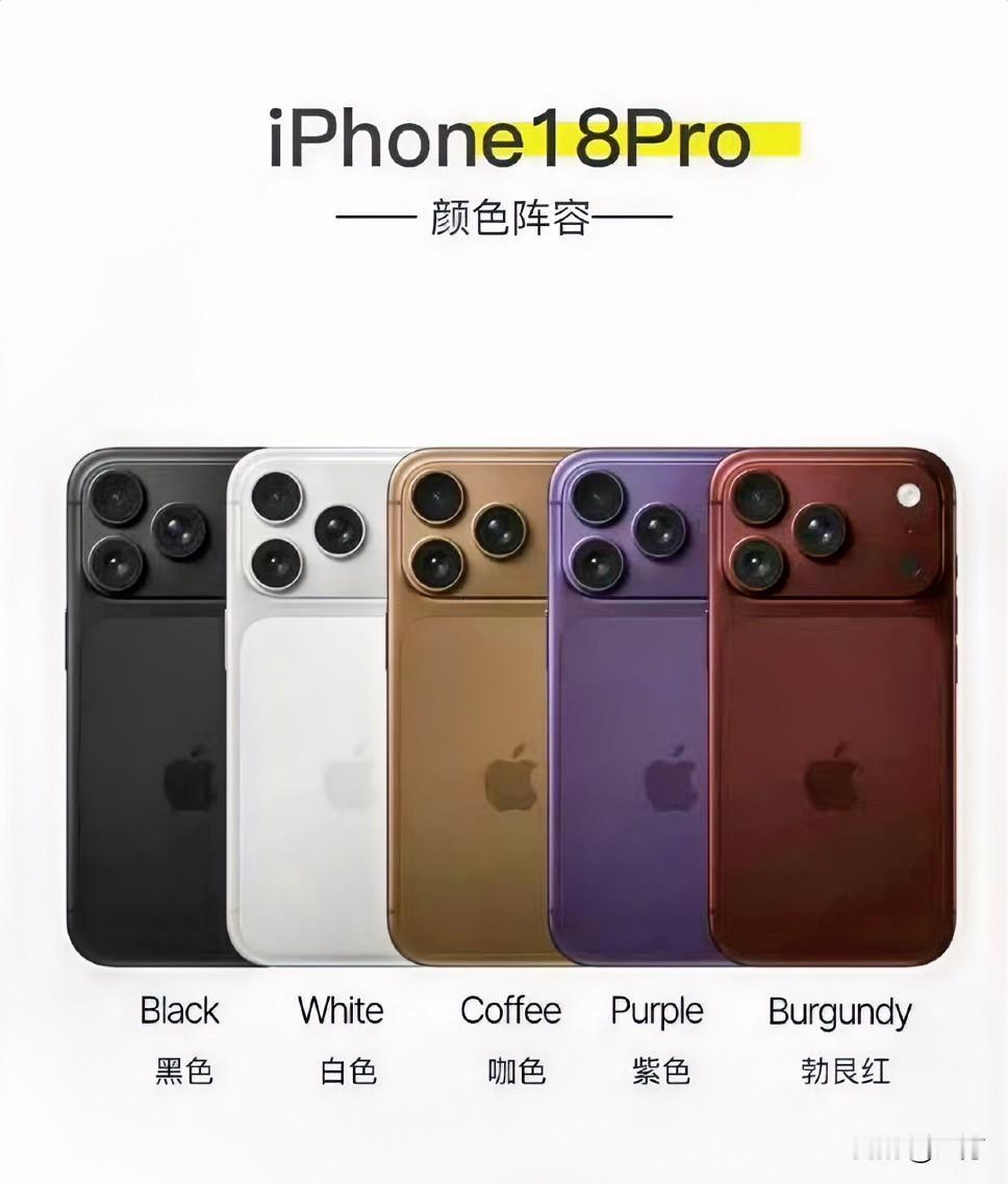 疑似iPhone18Pro新配色来了! 就在刚才,数码博主在社交网络放出了疑似iPhone 18 Pro的系列配色! 看来很多老用户还没有反应过来,毕竟手上的iPhone 17 Pro Max,还没有完全捂热,还有小半年的时间iPhone 18又要来了[捂脸] 根据目前收集到的信息来看,这次iPhone 18系列的配色,除了传统的黑白之外,主要的颜色是咖啡色紫色和特殊红色,尤其是他这个看起来比较特殊的红色:勃艮红,我想看起来好像有一点点偏深灰色与深褐色融合的感觉。 尤其是这个五个经典颜色弄到一起的,有一种深色巧克力的融合感,不知道是不是他们的主题定调,相对来说正经的iPhone 18经典系列和iPhone 18 air系列,看起来的颜色就要更加的清晰自然一些了。 当然,目前这个颜色是不是最终的定调,还得等苹果最终的确定,因为大家现在更关心的是苹果折叠手机,听说起价会超过1.4万,毕竟这个手机的形态与之前所有苹果都不一样,再加上又不便宜,所以他能不能够抢iPhone 18 Pro Max里的风头,这才是大家更加关心的。