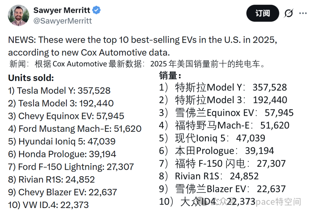Model Y成为全球唯一年销超百万的新能源车,是2025年纯电动车销冠