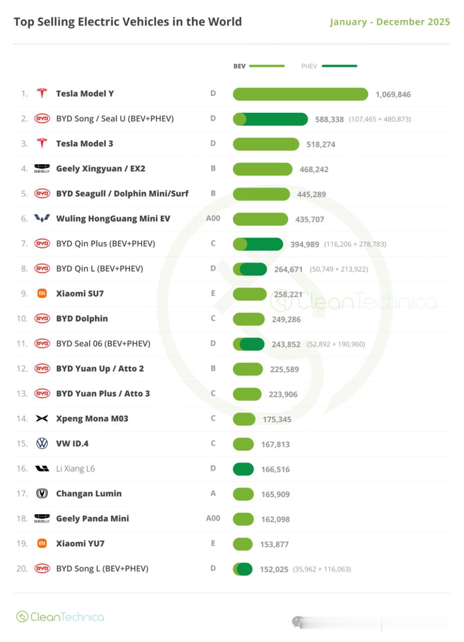 海外权威媒体Clean Technica统计发布2025年全球新能源车型销量排名,其中,特斯拉Model Y凭借超106.9万辆的年度累计销量,销量成绩达到第二名近2倍。