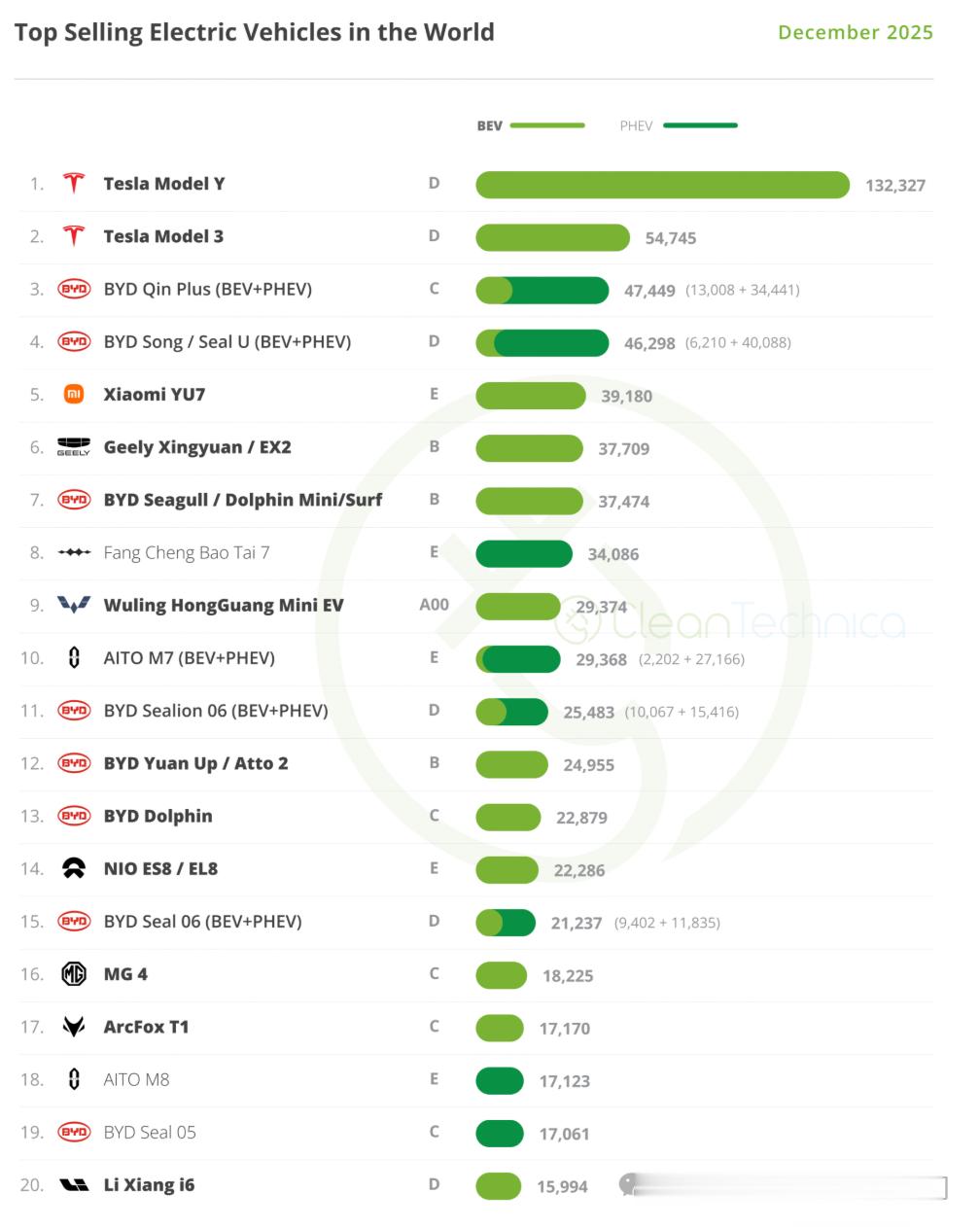 聚焦2025年12月全球新能源车销量榜单,特斯拉Model Y与Model 3两款车型包揽当月销量的冠亚军。