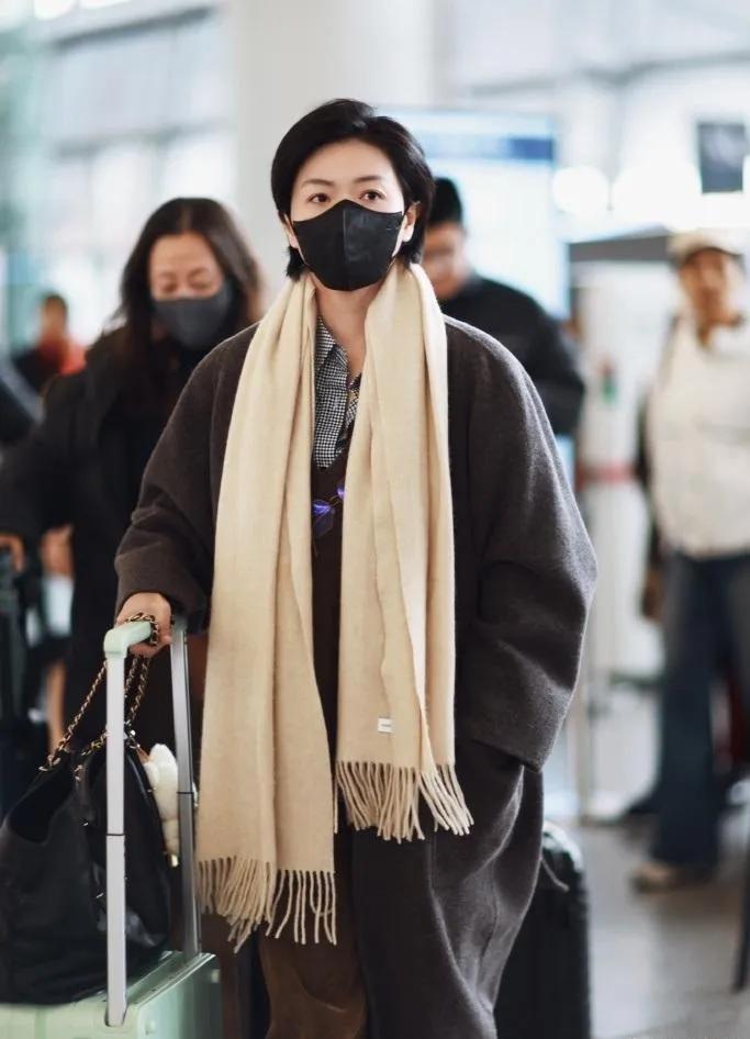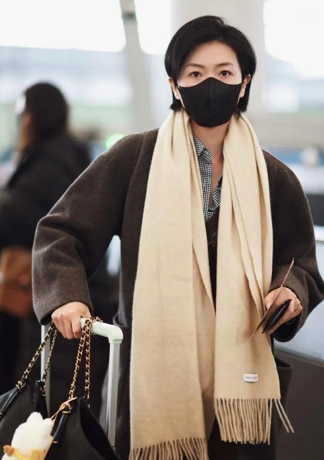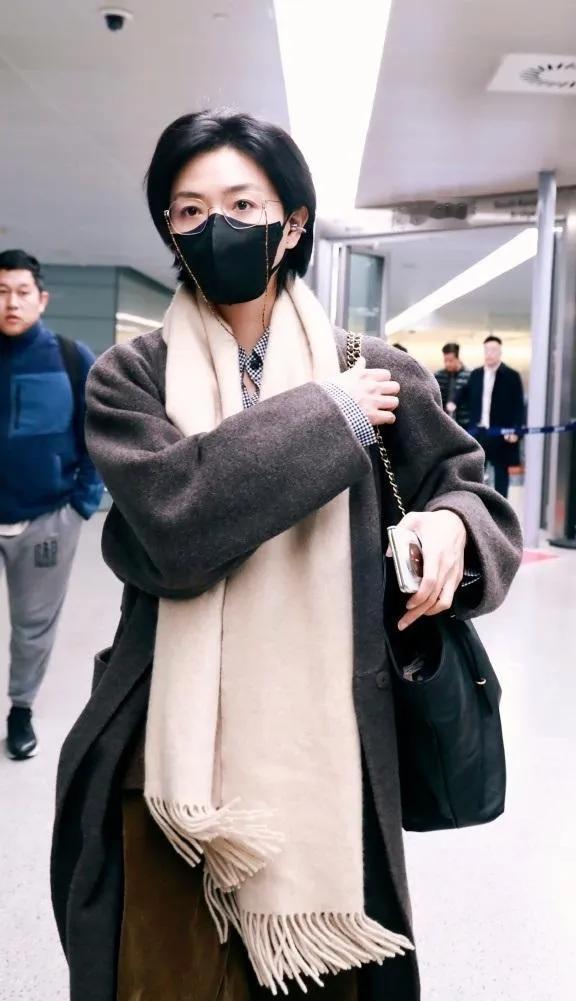 万茜机场私服封神! 深灰大衣+米白围巾,叠穿格纹衬衫,金丝眼镜链细节拉满,清冷又高级,这才是真·氛围感美女✨ 万茜 高级感穿搭