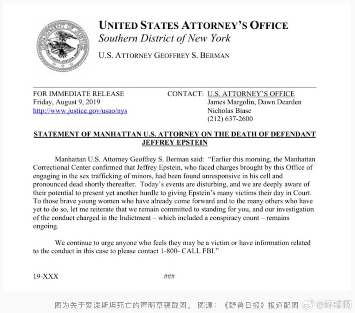 报道还称,美司法部最新公布的爱泼斯坦案相关文件中还包含一份有关爱泼斯坦死亡的声明草稿,出自纽约南区联邦检察官办公室。诡异的是,该声明日期为2019年8月9日,也就是爱泼斯坦被发现死亡的前一天。《野兽日报》称,这引发了人们对死因的新一轮质疑。