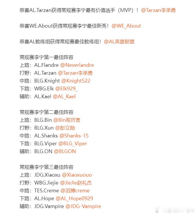 最佳阵容包括:AL圣枪哥、AL牢赞、BLG左手、WBG赵大哥、AL卡尔!