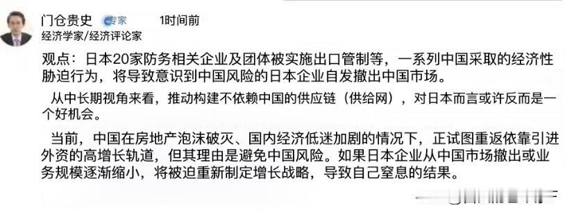 连发两条公告后,日本精英坐不住了:称中方是“作茧自缚,” 马年上班的第一天,中国联发两条公告涉及日本海陆空军工企业,就在全世界震惊不已的同时日本的经济学家坐不住了,他呼吁与日本企业不要太悲观,这对于日本来说是一个机会,中国一系列的行为,将会迫使日本企业自发的撤出中国市场。 短时间来说会非常的痛苦,但是长时间能够推动日本构建不依赖中国的供应链,对于日本来说是一个好事 同时他再次强调,如果中国如果继续执意为之的话,那么将会导致大批的日本企业还有其他外资企业撤出中国市场,对中国经济造成冲击,最终中方将会作茧自缚 对于他的言论,我们是怎么看的?看着是一个经济学家的名头,实际上则是挂羊头卖狗肉。政治理念和高市保持一样,中国之所以要制裁日本是因为他们加速推动在军事化,对地区安全造成影响,中国的精准反制制涉及日本的军工企业不涉及其他企业, 所以这些日本企业不但不会跑,还会自发地配合中国制裁,因为他们知道30%的利润全部都依赖中国供应链,反倒会对高市早苗无端挑起中日纷争心生怨恨。认为其祸国殃民毁坏日本经济根基。