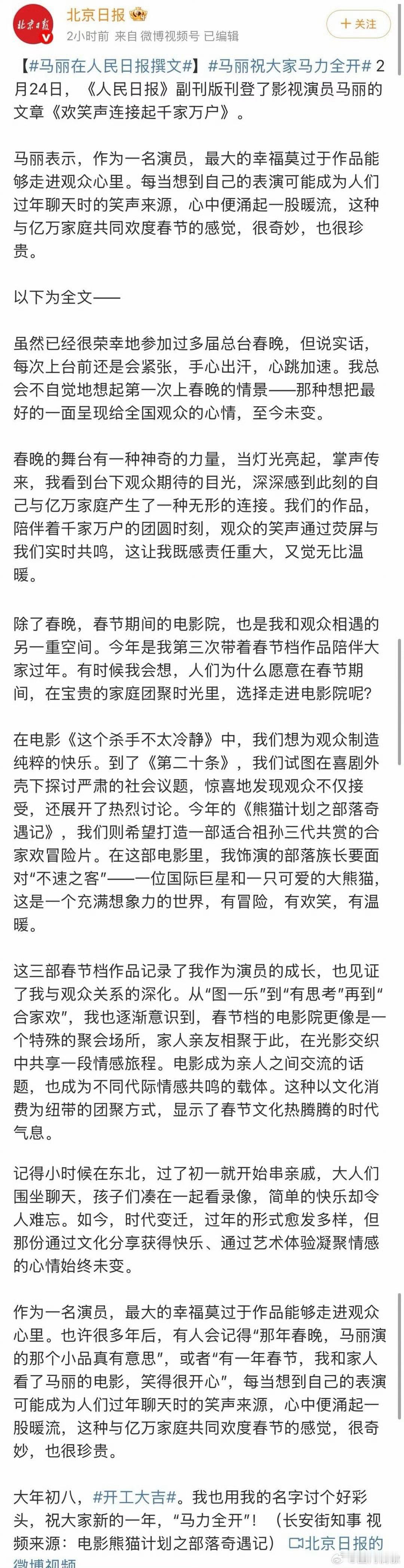 演员马丽人民日报撰文马丽在人民日报撰文 国民喜剧人的温柔剖白!紧张是因为珍视,蜕变源于用心。马丽见证了春节档的变迁,也成为了无数家庭的快乐记忆。大年初八,收下这份正能量,新一年我们一起“马力全开”!