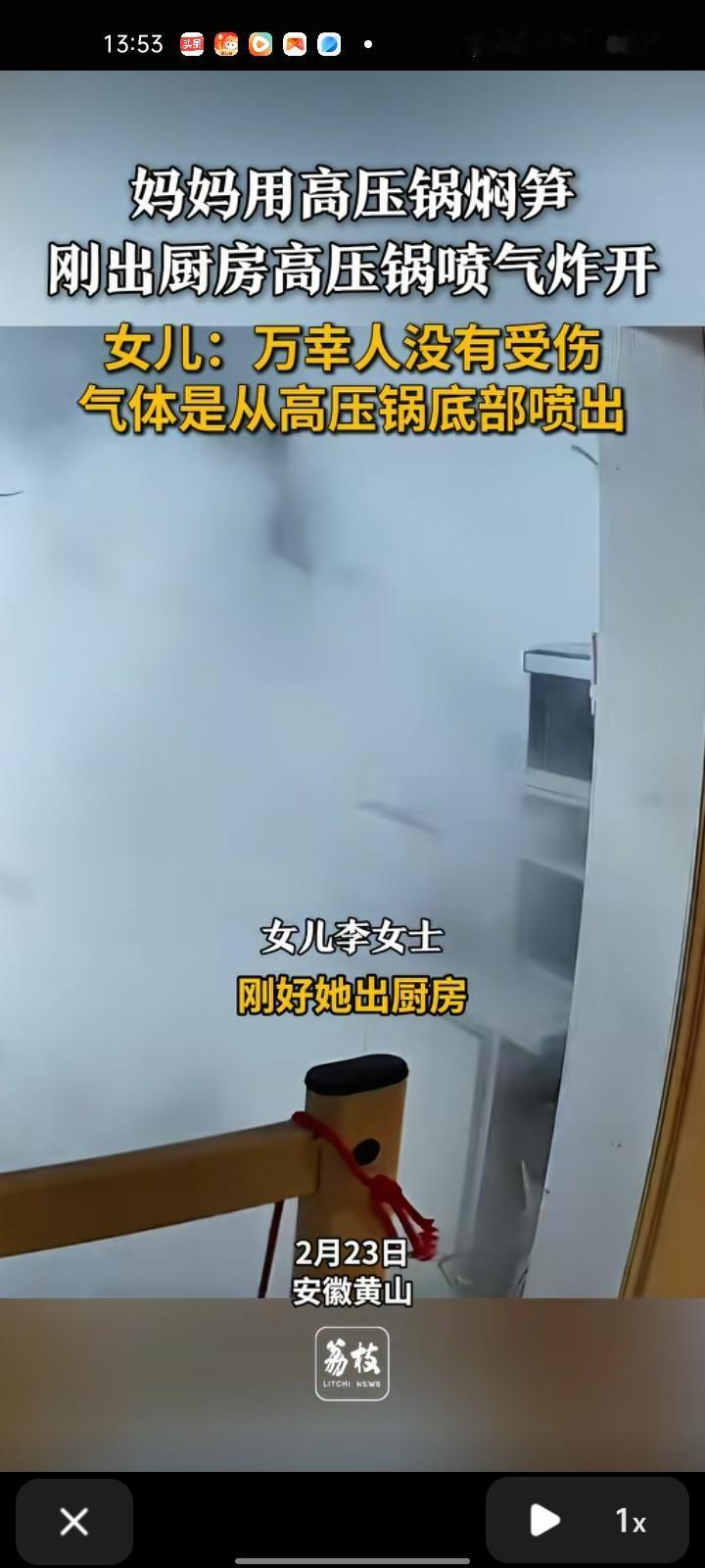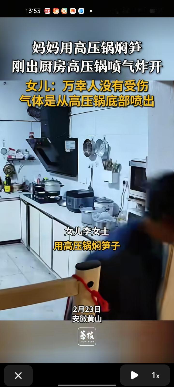2月22日,黄山市休宁县。李女士晒出监控视频,妈妈用高压锅焖笋,刚出厨房高压锅就炸了,气体从高压锅底下喷出来的,具体原因不确定。总之,人没事就好,直言“福大命大”。