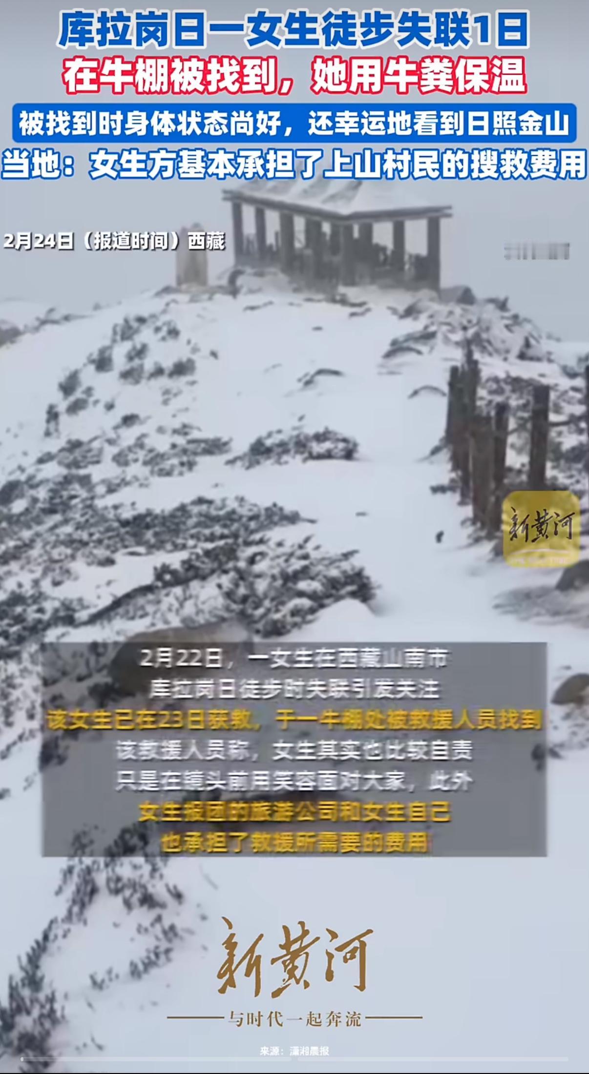 最近西藏库拉岗日徒步失联女生获救的事一名女生在高海拔徒步途中突然遇上暴雪,视线模糊、气温骤降,和队伍走散后彻底失联。在零下的寒夜里,她没有慌不择路,而是原路折返找到一处牧民牛棚,用牛粪堵住风口、盖在身上保温,还简单处理脚部保暖,靠着这份冷静和野外常识,硬生生熬过最危险的一夜。当地村民和民警连夜上山搜救,顶着风雪排查,终于在牛棚里找到她,人平安无事。更让人意外的是,脱险之后她主动提出承担救援产生的相关费用,不把别人的付出当成理所当然,这件事很快引发全网讨论,有人佩服她的自救能力,有人点赞她的担当,也有人借此反思户外出行的安全问题。 很多人第一眼看到“牛粪保温”,觉得有点好笑又有点心酸,可仔细想想,这才是绝境里最实在的生存智慧。高原暴雪天,失温几分钟就能要命,她没有哭哭啼啼,也没有盲目乱跑消耗体力,而是先找掩体、再做保温、稳住状态等待救援,每一步都踩在关键点上。比起那些装备齐全却一遇险就崩溃的人,她的冷静和常识,才是真正的救命装备。我们总说户外有风险,可真正的风险从来不是山路和天气,而是轻敌、慌乱和缺乏准备。她用最朴素的办法,给所有人上了一堂野外自救课:遇到危险先稳心,再想办法,不放弃自己,才有可能等到希望。 而主动承担救援费这个举动,更是圈粉无数。现在不少人出门遇险,总觉得救援是应该的,甚至把麻烦别人当成天经地义,可这位女生心里有数,知道村民和民警冒着风雪上山有多危险,知道救援要花时间、花精力、花成本。她不推诿、不逃避,平安之后第一时间担起责任,这份懂事和体面,比自救本身更难得。这不是钱的事,是做人的分寸,是懂得感恩、懂得边界的教养。我们赞美她,不只是因为她活下来了,更是因为她活得清醒、活得体面,既不拖累别人,也不委屈自己。 美景背后藏着风险,出发前要做足功课,遇突变要懂得止损,真到绝境里,冷静比装备更重要,常识比勇气更管用。生活里也一样,谁都会遇上突如其来的“暴风雪”,工作的难题、生活的坎坷,都像那场冻人的风雪,慌解决不了问题,乱只会让情况更糟。静下心找办法,守住底线懂担当,再难的夜也能熬过去,再大的风雨也能等到天晴。 来源:潇湘晨报