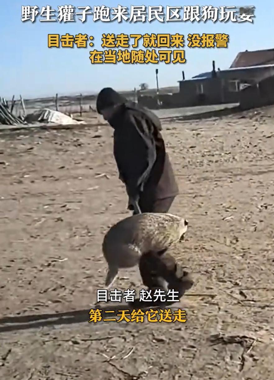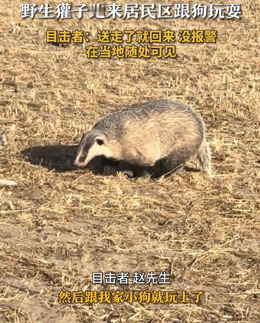 内蒙古锡林郭勒盟,一位牧民在家里休息时听到外面狗狗在叫,当时还在担心是不是来了狼,结果出来一看,确实是野生动物,不过是一只野生獾子来找狗狗玩,牧民也没在意,直接一铲子就给它运走了,网友:你是怎么说服它上铲子的 当天,老赵正在屋里歇着,就听见外头自家的狗叫得欢。推门出去一瞅,眼前的场景让他哭笑不得。哪有什么狼,是家里那只狗,正跟一只圆滚滚的野生獾子在院子里头闹腾呢,俩家伙你拱我一下,我扑你一下,玩得正起劲,跟俩认识多年的老朋友似的 老赵一看就乐了,在这地界儿生活,看见个把野生动物就跟吃饭喝水一样平常,他压根没慌,也没想着报警 但总不能让这獾子老在院里待着,于是老赵转身回屋,抄起一把铁锹,走到獾子跟前。接下来的一幕,成了网上的名场面:他也不赶也不轰,直接把铁锹往这獾子身下一塞,一撬,就这么给端起来了 这獾子也不知是被撸顺了毛还是压根没想反抗,趴在铁锹上一动不动,跟一尊雕塑似的,被老赵稳稳当当地端出了院子送走 本以为这事儿就完了,结果第二天,这獾子又晃悠着来了,继续找狗玩。老赵没办法,又拿铁锹给它端走 看到这,好多人不清楚,这獾子到底是啥动物,咋看着憨憨的,它到底危不危险?这事其实得分两头说 得明白,这玩意儿看着萌,但绝对不是善茬。獾子属于鼬科动物,跟黄鼠狼是亲戚,别被它敦实的外表骗了,那家伙脾气可不算好,野性挺大 那爪子老长,专门刨洞用的,真要挠人一下子够呛,而且牙口厉害,咬合力惊人。一般的野生动物其实都挺怵它 另一方面,也是最有意思的一点,这獾子可能真不是冲着人来的,它是冲着狗来的。别笑,这还真有可能。獾子是鼬科动物,狗是犬科动物,虽然种类不同,但幼年时期的动物都有爱玩的天性。尤其在草原这种相对开阔的环境里,家犬的气味对于野生动物来说,不一定全是威胁,有时候也可能是一种好奇和吸引 内蒙古野生獾子跑居民区找狗玩