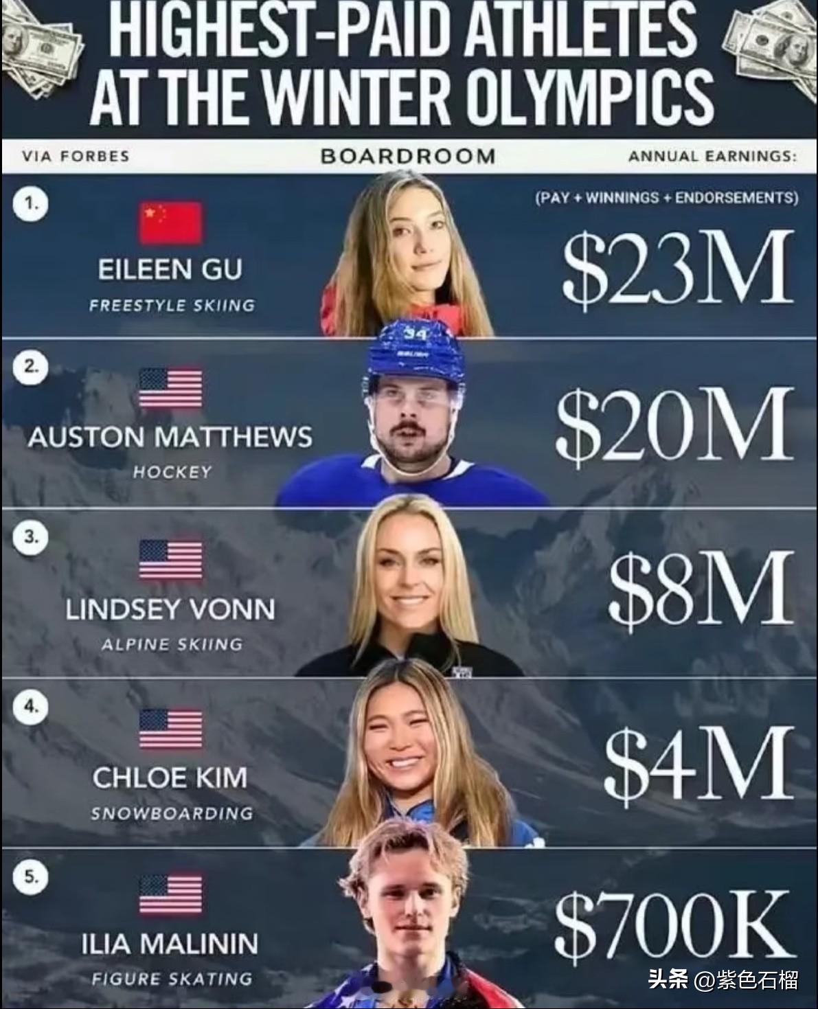 近日,福布斯排行榜发布了本届意大利米兰冬奥会运动员收入排行榜前五名。中国滑雪运动员谷爱凌以2300万美元的收入排名第一。其余四名均为美国运动员,他们分别是: 1、谷爱凌:中国自由式滑雪运动员,年收入2300万美元。 2、奥斯顿。马修斯:美国冰球运动员,年收入2000万美元。 3,林赛。沃恩,美国高山滑雪运动员,年收入800万美元。 4、克洛伊·金:美国单板滑雪运动员,年收入400万美元。 5、伊利亚·马利宁:美国花样滑冰运动员,年收入70万美元。 可见,谷爱凌作为一名滑雪运动员的全球影响力和商业价值具有绝对优势。 对此,大家怎么看?欢迎评论区聊聊。