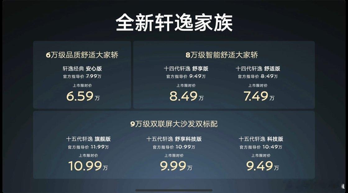 十五代轩逸三个配置:入门9.49万,中配9.99万,顶配10.99万。