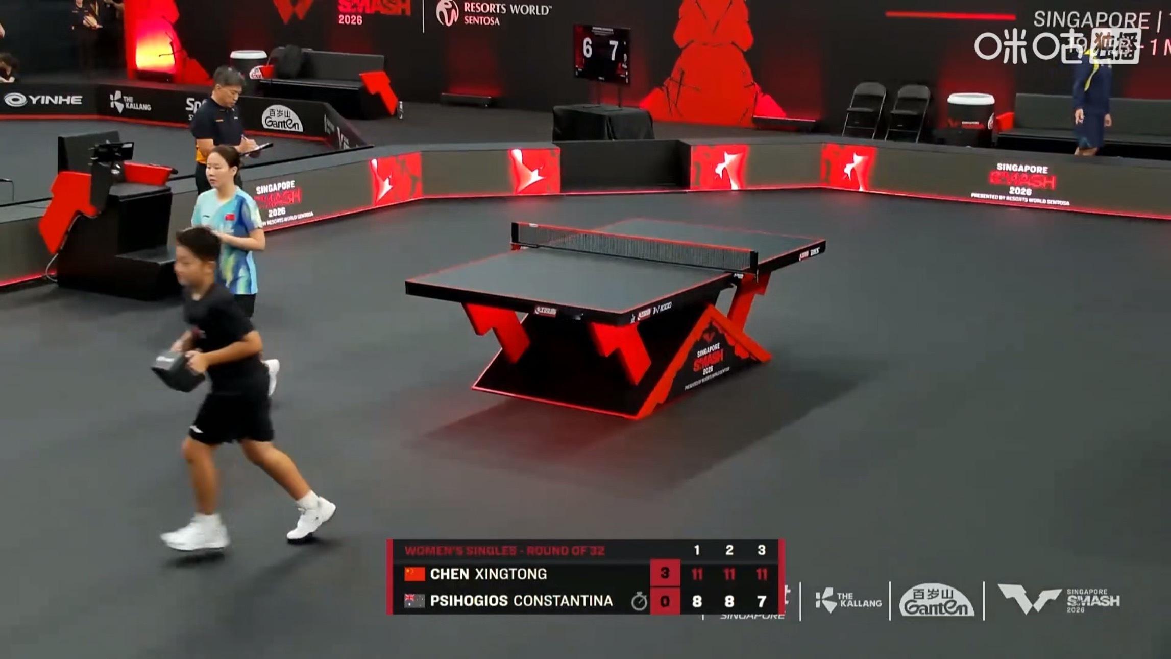 陈幸同3比0普西霍吉奥斯(11-8,11-8,11-7)晋级WTT新加坡大满贯2026 女单16强