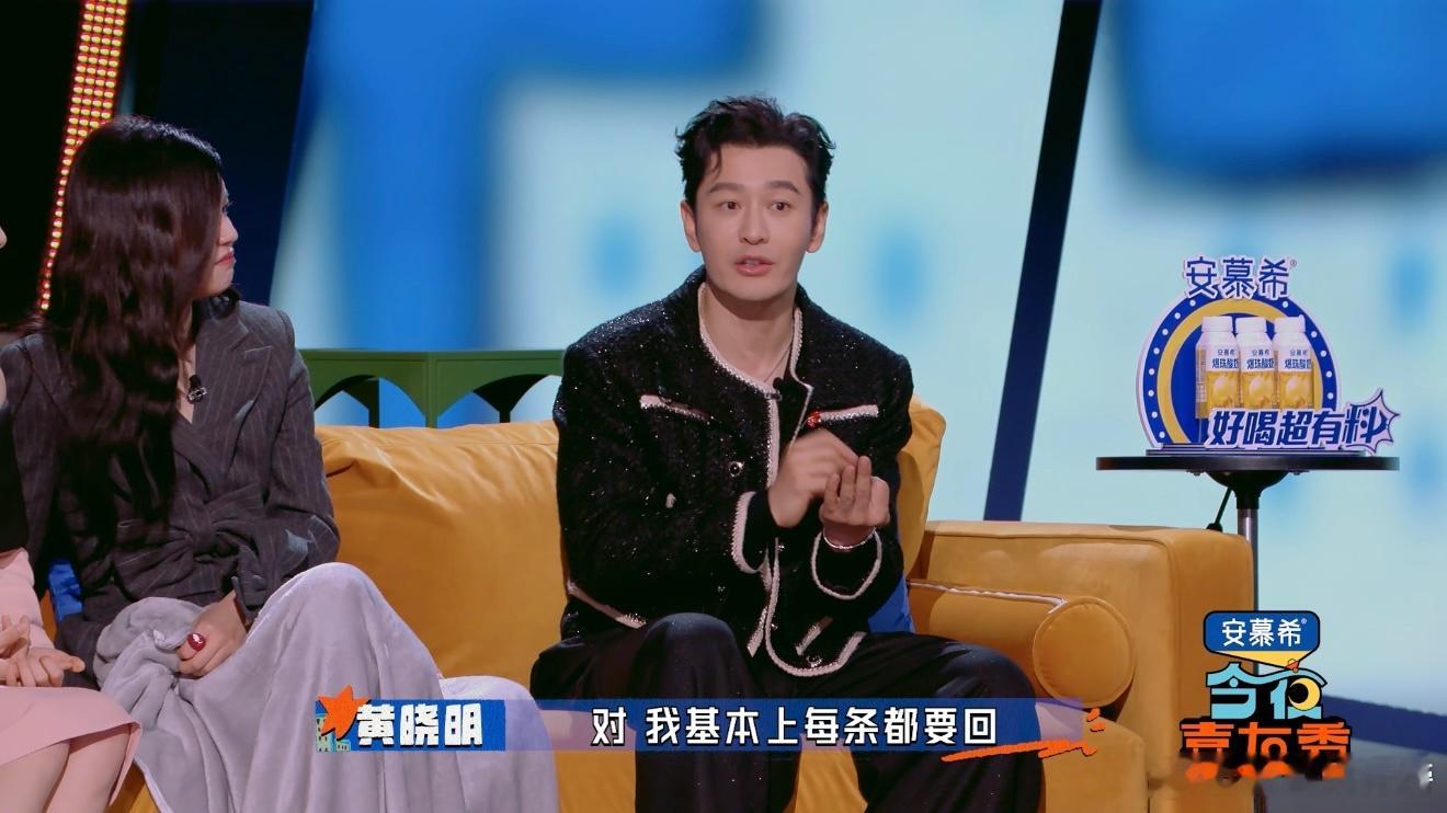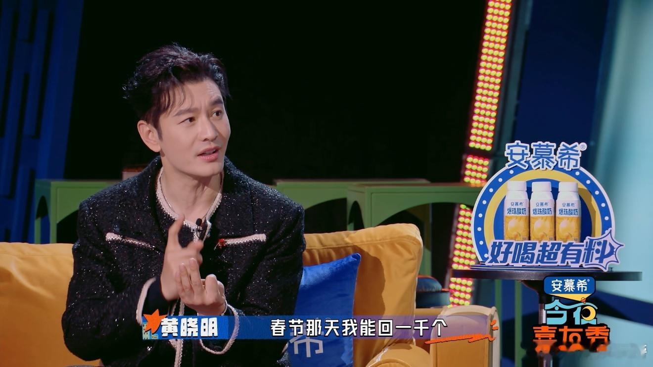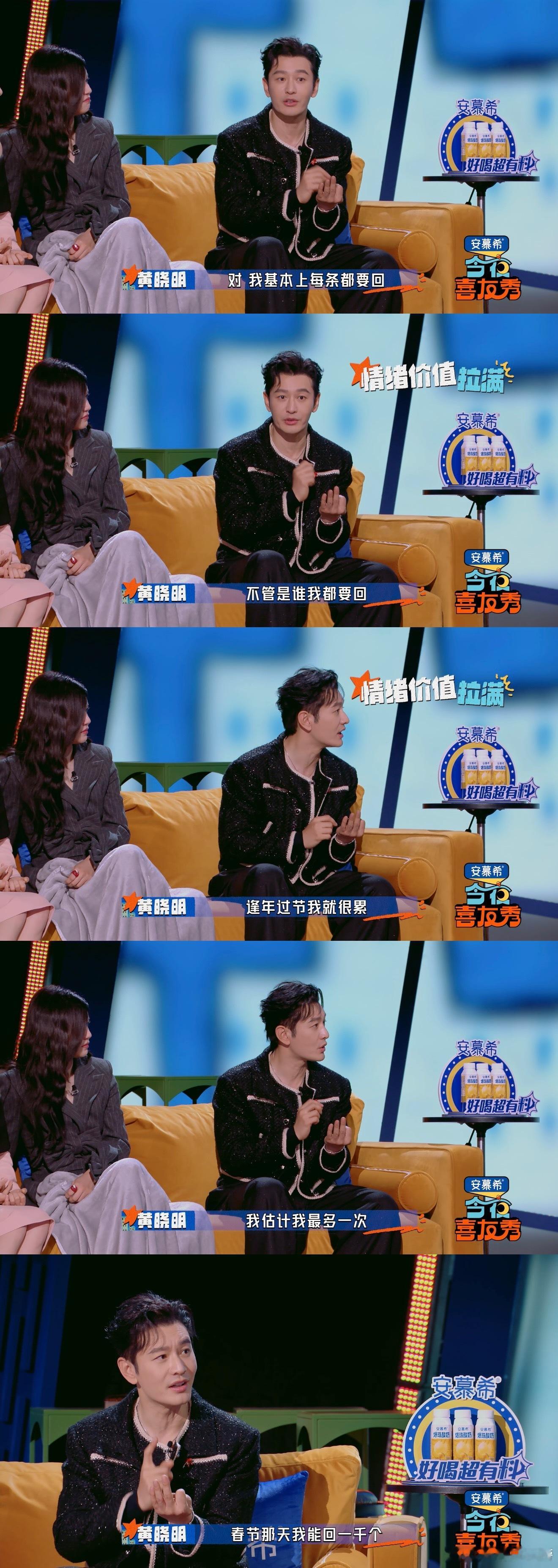 黄晓明自曝春节要回1000条消息今夜喜友秀 今夜喜友秀里黄晓明聊到自己的消息习惯,只要有未读就一定要处理,春节高峰期一天回上千条,连他自己都觉得有些疲惫