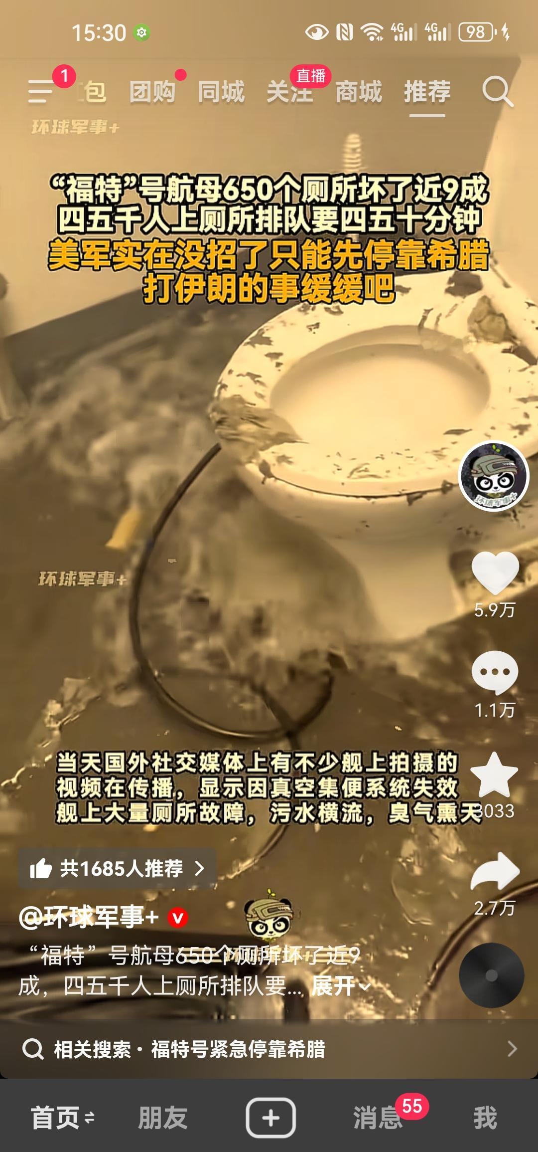 美军福特号航母厕所坏了九成!转自环球网