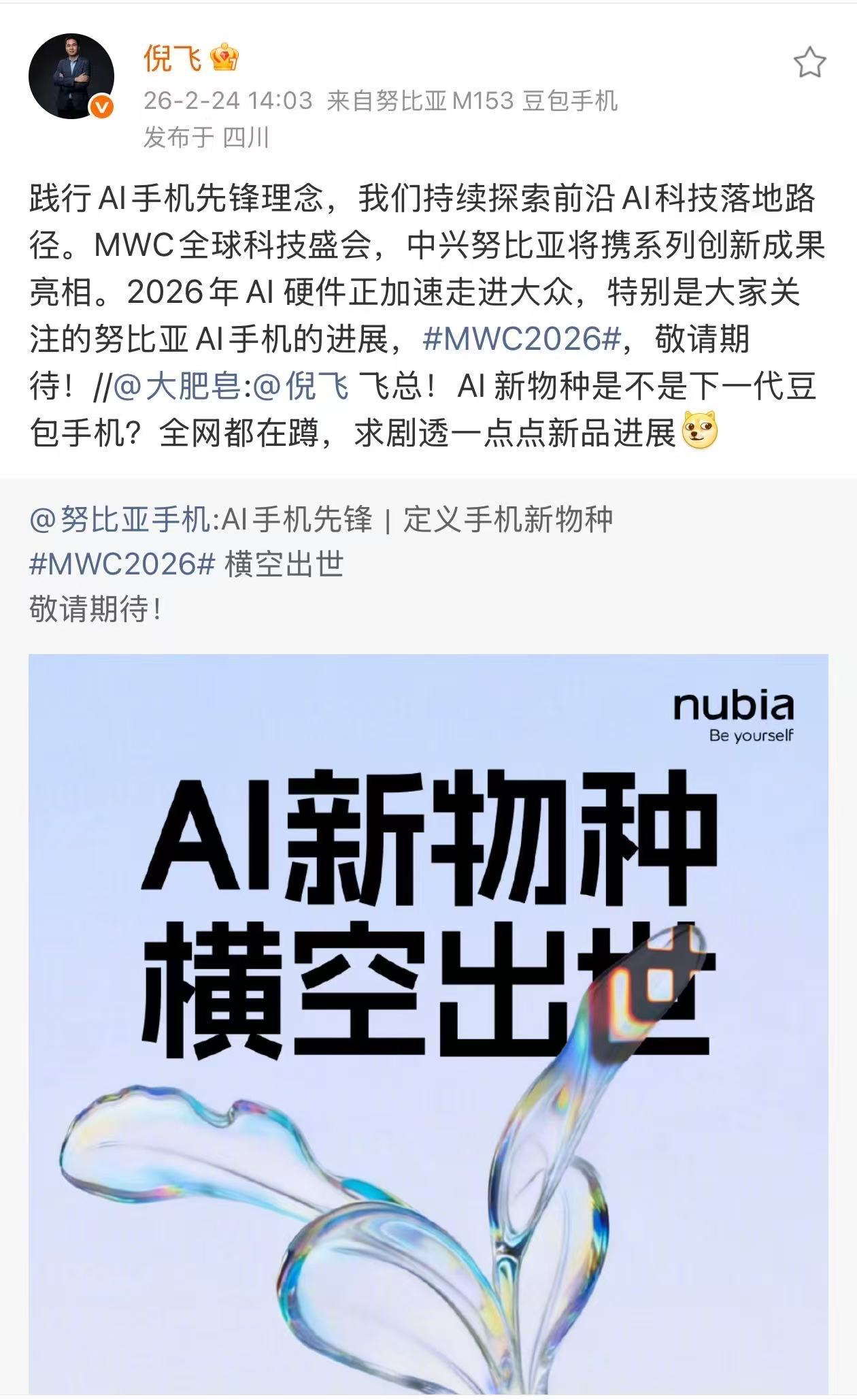 前一段时间,努比亚与豆包联合开发的M153豆包手机火了,且广受大家的喜爱,今天努比亚也宣布在MWC2026上发布一个全新的AI手机,那我猜应该是豆包手机的下一代?倪飞疑似透露新一代豆包手机进展