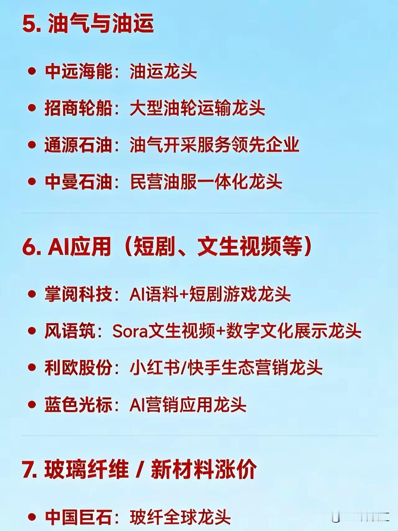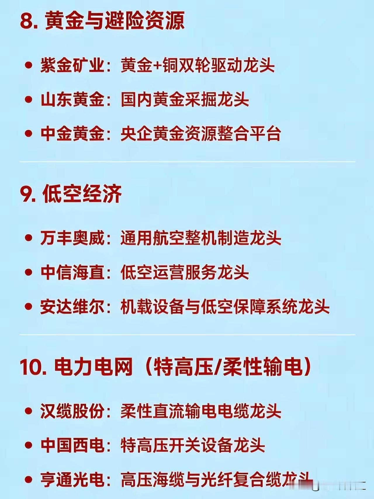 2026年2月24日十大热点科技及其产业链核心龙头1. AI算力与光模块中际旭创:全球光模块龙头,英伟达GB300核心供应商新易盛:高速光模块弹性龙头天孚通信:光器件隐形冠军,深度绑定英伟达华工科技:AI高速光模块产线满负荷运转的龙头企业2. 人形机器人三花智控:人形机器人热管理系统龙头绿的谐波:谐波减速器绝对龙头双环传动:RV减速器龙头百达精工:机器人整机结构件领先企业天奇股份:机器人整机及智能装备龙头3. 存储芯片深科技:先进封装与存储模组龙头兆易创新:NOR Flash全球龙头,DRAM重要厂商北京君正:车用存储芯片龙头江波龙:国产存储模组龙头4. 商业航天 / 卫星互联网中国卫星:卫星制造国家队龙头航天电子:航天配套电子系统龙头臻镭科技:卫星通信射频芯片龙头再升科技:星箭制造材料及洁净技术领先企业5. 油气与油运中远海能:油运龙头招商轮船:大型油轮运输龙头通源石油:油气开采服务领先企业中曼石油:民营油服一体化龙头6. AI应用(短剧、文生视频等)掌阅科技:AI语料+短剧游戏龙头风语筑:Sora文生视频+数字文化展示龙头利欧股份:小红书/快手生态营销龙头蓝色光标:AI营销应用龙头7. 玻璃纤维 / 新材料涨价中国巨石:玻纤全球龙头山东玻纤:国内玻纤产能扩张主力再升科技:高性能玻璃微纤维龙头8. 黄金与避险资源紫金矿业:黄金+铜双轮驱动龙头山东黄金:国内黄金采掘龙头中金黄金:央企黄金资源整合平台9. 低空经济万丰奥威:通用航空整机制造龙头中信海直:低空运营服务龙头安达维尔:机载设备与低空保障系统龙头10. 电力电网(特高压/柔性输电)汉缆股份:柔性直流输电电缆龙头中国西电:特高压开关设备龙头亨通光电:高压海缆与光纤复合缆龙头