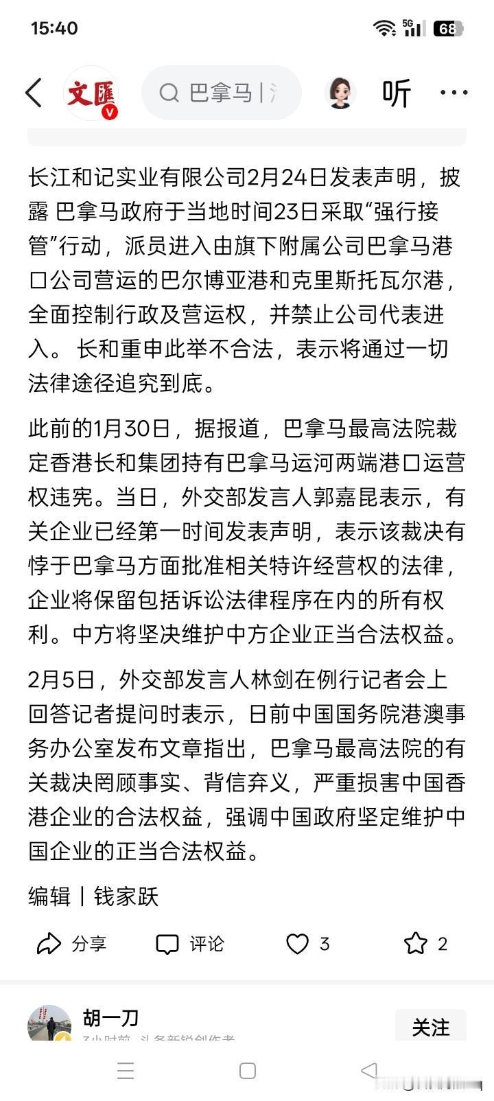 终于动手了? 香港长和集团声称巴拿马政府不合法,但这个有用吗? 巴拿马最高法院在此前的1月30日,已经对长和集团运营巴拿马运河两端港口作出了裁决。据网络上的消息,2月23日,巴拿马政府已经强行接管巴拿马运河两端港口的运营权,并且禁止长和集团人员进入。 长和集团重申巴拿马政府的行为不合法,表示将通过一切法律途径追究到底。但令人疑惑不解和迫切需要了解的是,全世界还有什么地方有一个或数个机构,可以比巴拿马最高法院更高管辖极的法院,并且可以废除巴拿马最高法院的裁决?或者拥有比巴拿马最高法院对运河两端港口更高的管辖权? 一个商业集团,与一个虽然国家不大,但背后势力可能很大的国家的最高法院和政府,谈合法与不合法,不知道是否真正具有实际操作的意义。因为最高法院和政府,在一般人的认知中,似乎就是法律法规的化身,也就是说,这好像就是与法律本身打官司。真相究竟是个什么,还请网友们明示。