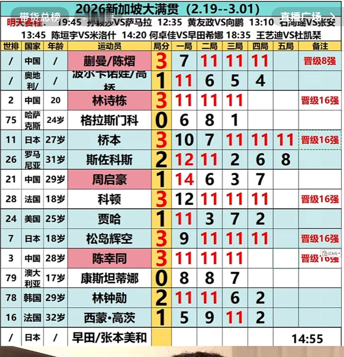 新加坡大满贯2月24日午场赛果松岛辉空3:1贾哈,晋级男单16强! 陈熠/蒯曼3:1波尔卡诺娃/高桥, 晋级女双8强! 林诗栋3:0门科,晋级16强! 桥本帆乃香3:2斯佐科斯,晋级16强! 周启豪1:3科顿,止步32强! 陈幸同3:0康斯坦蒂娜,晋级16强! 周启豪遗憾出局, 一局后就断电了,17岁科顿 打的太猛,有小勒布伦的劲头! 林诗栋实力还是强, 有望晋级四强! 桥本晋级后,下一轮将对阵陈熠, 陈熠准备的怎么样, 以往的战绩,陈熠两次输桥本, 这次一定加油!