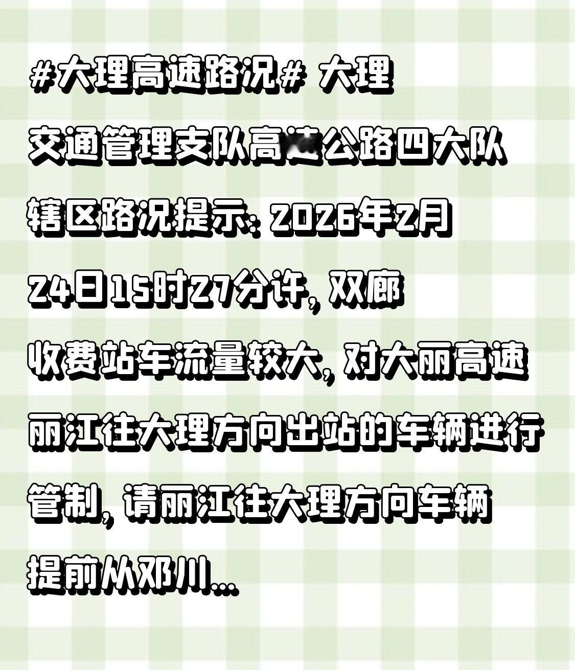 大理交通管理支队高速公路四大队辖区路况提示: 2026年2月24日15时27分许,双廊收费站车流量较大,对大丽高速丽江往大理方向出站的车辆进行管制,请丽江往大理方向车辆提前从邓川下收费站行驶国道进入双廊。请各位驾驶人行驶期间注意路面情况,谨慎驾驶,保持安全车距,严防追尾、刮擦。