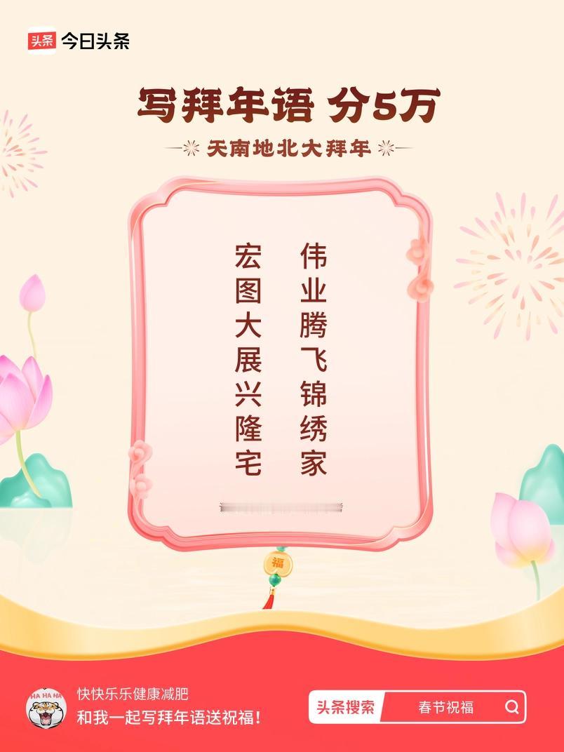 写拜年语送祝福新春拜年送祝福!我的祝福是:“宏图大展兴隆宅,伟业腾飞锦绣家”!快来一起写祝福吧戳这里,一起领红包>