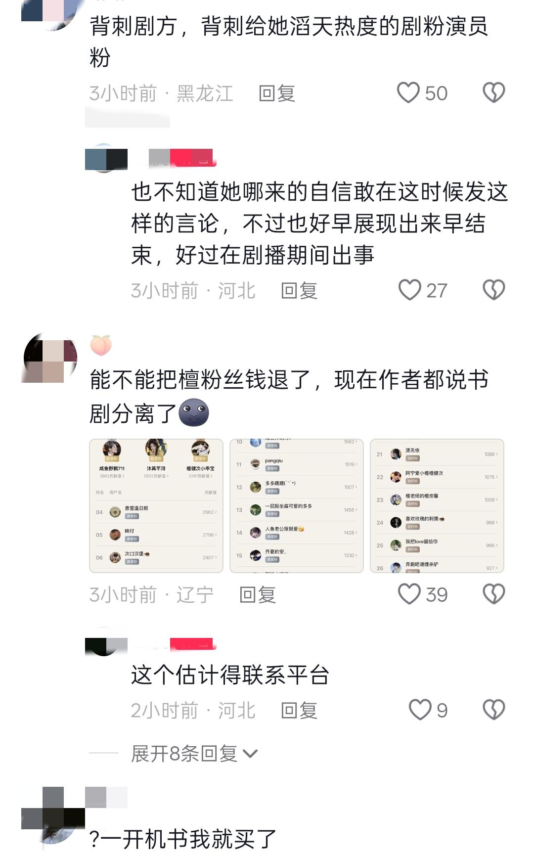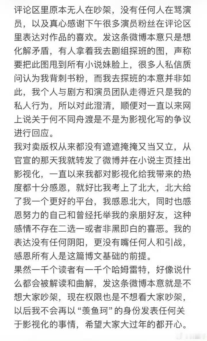 真的拎不清,闷声赚钱不好吗?这是什么操作?一个做生意的人看见这样的商业案例得被气死。其实绝大多数小说作者都是不会针对影视化发表看法的,因为只要原作者一出来说话必然会引起争端,羡鱼柯这种才是少数! 演员和演员粉丝一头雾水莫名其妙!没见过这样的作者,第一次见断后路的,把买她版权的剧方背刺了,发的内容太得罪人了,也得罪了一堆最近因为影视化过去看小说的人,好好的热度自己往外推! 这件事很简单,无非就是作者本人和她的老粉丝因为何不影视化问题有矛盾,再加上作者探班剧组引起某些不知真假的书粉不满! 但是作者万不该为了解决自己的个人事情而在公开平台发表不明缘由的言论,在信息不等的网络时代给了某些黑子拉踩的机会,粉丝用言论回击非常正常,但全程下来最无辜的就是演员粉丝和一些因为演员出演而全程关注的剧粉! 说白了选择了影视化就要承担影视化带来的舆论,好处就是赚钱了,那自然而然不好的方面就是自己的书粉有意见,任何一个小说都这样,原本就有巨大ip的小说作者被骂的惨多了也能保持沉默。 檀丝只是善良,不是没脾气,捧一下原著还捧出错了,我寻思之前合作过的作者比这位影响力大多了吧!个人认为其功底不能跟桐华和墨宝非宝同提并论! 大哥当年和桐华合作两部,檀健次还为长相思相柳专门自掏腰包拍了动画,也没见书粉说桐华跟剧组演员走得近的,这心态以后还有剧改编嘛,难不成部部都要呵护自己的书粉? 现在看桐华是真厉害呀,长相思那么大的修罗场骂的狗血淋头她都扛过来了,用滤镜解释一切,逻辑闭环。 最好笑的是原本很和谐,不和谐的声音在角落里根本没几个人看得见,大部分书粉和剧粉和睦相处,大家共赢,结果作者非顺着一部分不理智书粉出来拉偏架,搞的跟剧粉伤害书粉一样! 要知道剧粉演员粉为了不伤害那一小撮不满意的书粉,一直说的是不说天选不说天选,遇见个不想影视化的也是耐心解释演员不错或是尊重祝福! 不说别的,小说现在这个高热度是演员剧组演员粉和大部分刷到精美路透的路人带来的,不少演员粉也买了原小说,出钱出力,还要被骂被背刺,真是费力不讨好! 还有一个问题就是我这天天上网冲浪的,根本没看见她说的不和谐音符,看到的是彼此成就、爱书爱剧,然后作者出来一顿茶!格局这种东西真是一下就看出来了! 搞得现在为演员去看书的粉丝一头雾水,到处问怎么了?简直天降大祸。编剧出身,却不知道书改剧会有不同声音?写书同时为推剧做了万全准备,却丝毫没有承担书改剧负面因素的心理准备和能力? 写谍战的就这格局和水平,是自身能力不够还是使用谍战策略无事生非刻意误导?演员粉书剧分离、别看原著了,本身剧本肯定与书不同,当初不用编剧出身的她改编原著现在看来不是坏事,要不然戏都不够她一个人演的。 就算要跟自己以前的书粉解释也没理由让其他人介入你们之间的因果,没人喜欢介入这些,没人喜欢莫名其妙被带上。自己笔下人物能遇到有演技会思考的演员是多么可遇不可求的,一片和谐共赢还主动掀桌! 作为一名二十多年的老书虫,各种类型的书都看过,之前在各种榜上都没刷到过这本书,不可否认作者文笔确实好,前期氛围场景铺垫叙述很有功底,但后期及结尾感觉不像一个人写的! 既然作者自己说了书剧分离,那就请小说粉去看小说,不要在恶意攻击艺人了,已经很尊重了,剧怎么样也跟她们没有关系,已经移除书架,各自安好,不给作者带来困扰,尊重每只青蛙和它的井! 以后只期待剧了,期待檀健次谢却山! 檀健次 谢却山