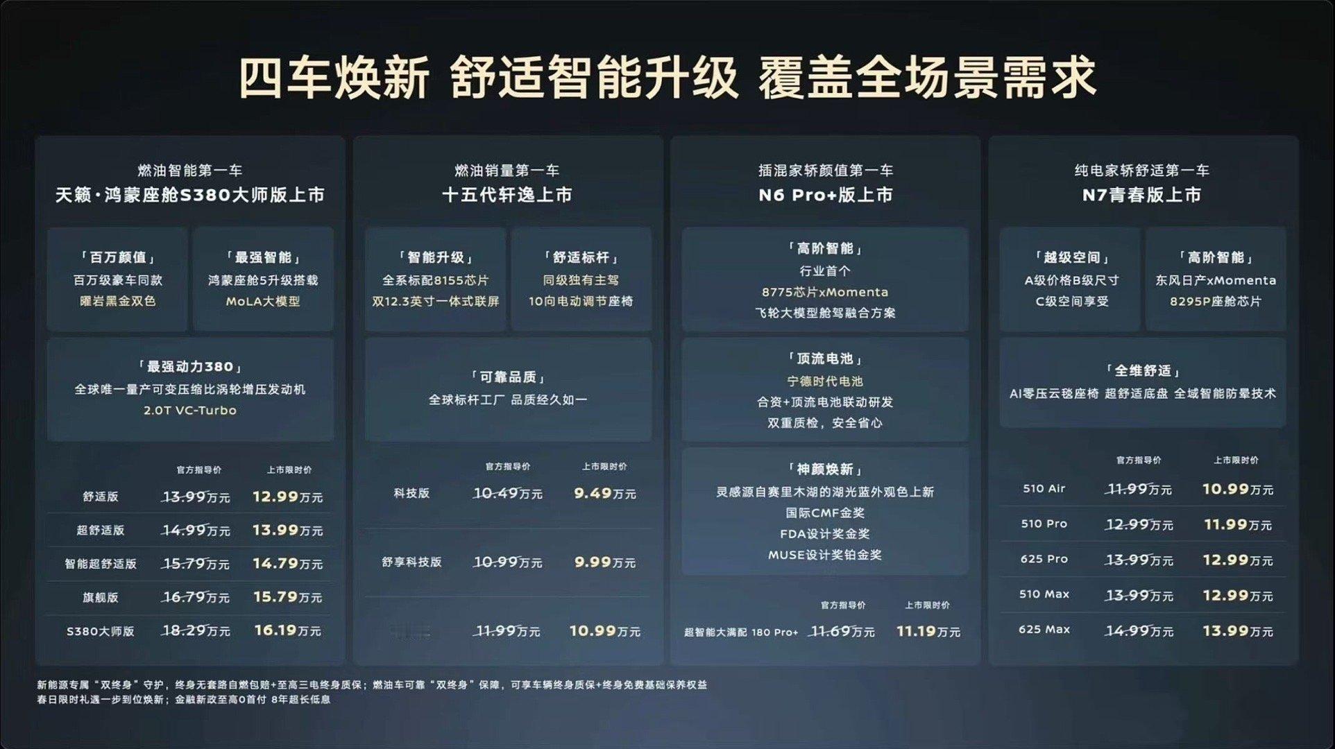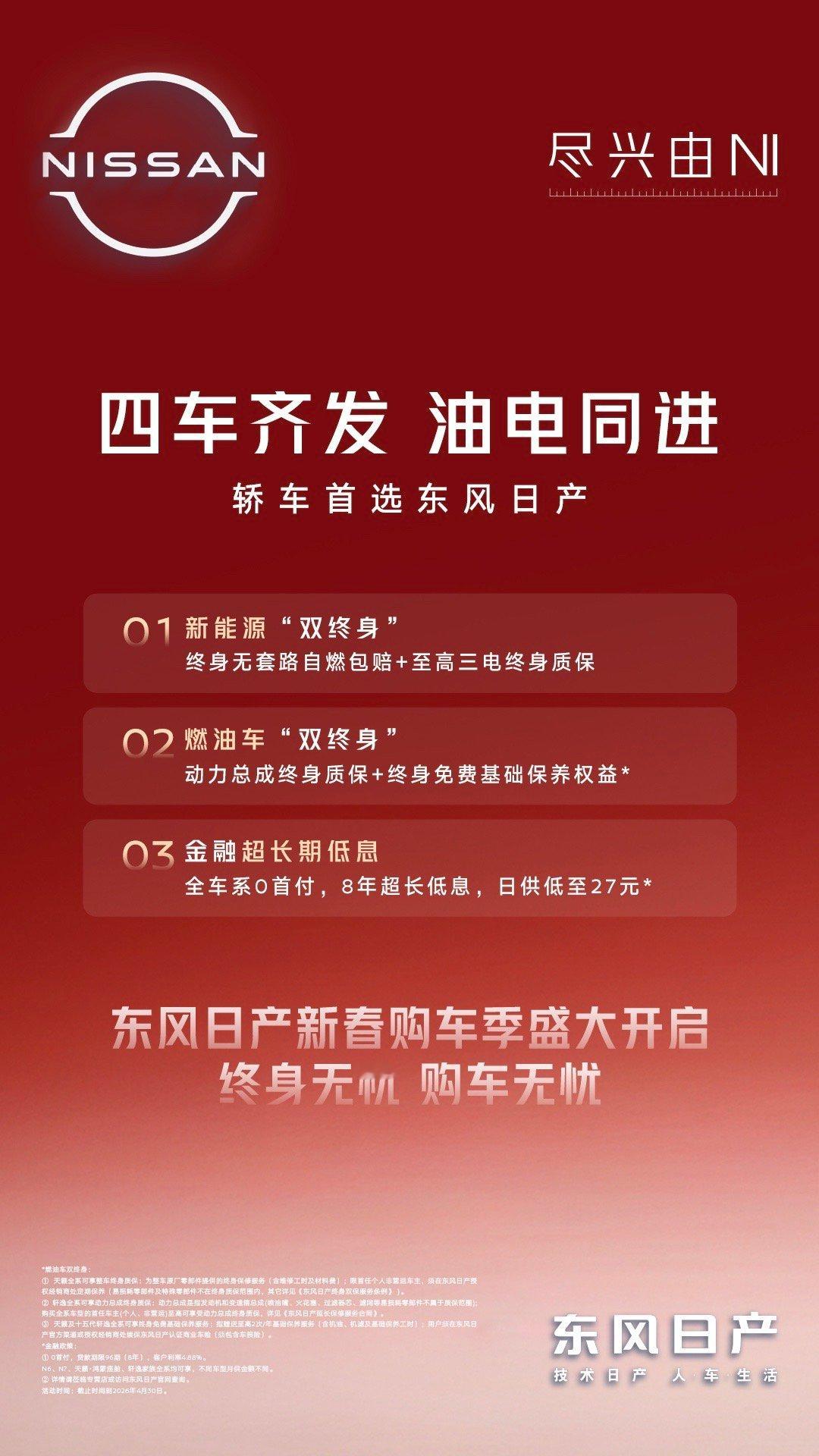 东风日产节奏真的快 东风日产开年王炸四连发 燃油、插混、纯电赛道都群贤毕至!轩逸是国民家轿老熟人了,20年攒下600万销量,妥妥的用实力说话,十五代新款,8155芯片+双联屏全系标配,日常家用通勤没毛病!天籁鸿蒙座舱S380大师版的曜岩黑金双拼色更是没话说,鸿蒙座舱加持,油车也能玩转满格智能!N6 Pro+上新,宁德时代电池,搭配Momenta智驾,还有来自赛里木湖的湖光蓝车色,颜值实力双在线!N7青春版纯电10.99万起,越级空间+防晕车系统,纯电新手闭眼入,也不踩坑!新能源三电终身质保,燃油车终身免费保养,大厂的诚意直接拉满!不管是小家庭通勤、年轻人选第一台车,还是想换智能座驾,总有一款适合你!