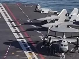 福建舰官兵给全国人民拜年,三种舰载飞机以待飞状态进行展示。图中两个细节,一个是右上角的两架歼三五,处于机翼折叠状态。另一个细节是一号弹射器位置上的歼三五,更换了双色搭配的新涂装,整的妥妥豪车范。