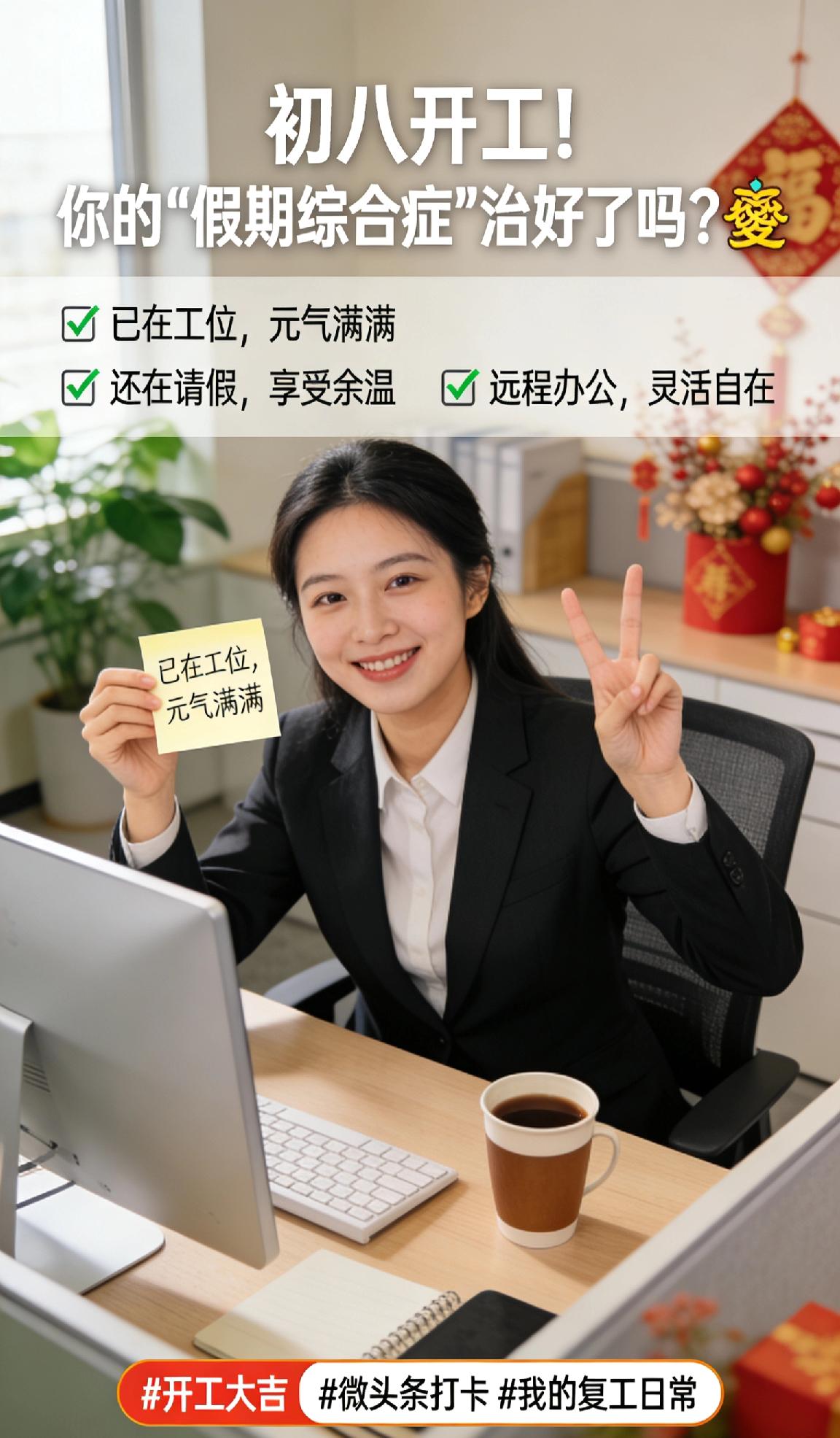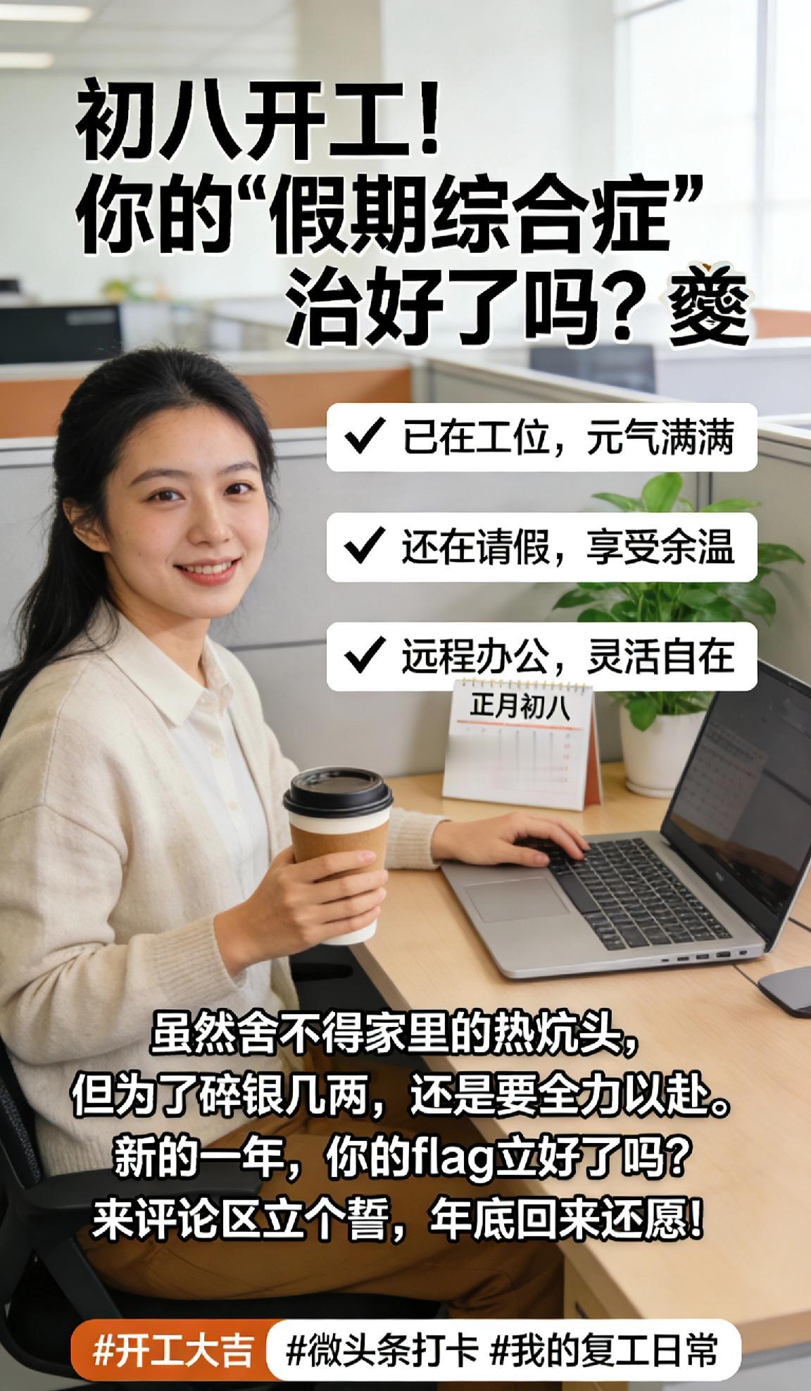 初八开工!你的“假期综合症”治好了吗?🤔 各位包子们,早安!今天是正月初八,你复工了吗? ✅ 已在工位,元气满满 ✅ 还在请假,享受余温 ✅ 远程办公,灵活自在 虽然舍不得家里的热炕头,但为了碎银几两,还是要全力以赴。 新的一年,你的flag立好了吗?来评论区立个誓,年底回来还愿! 我的复工日常
