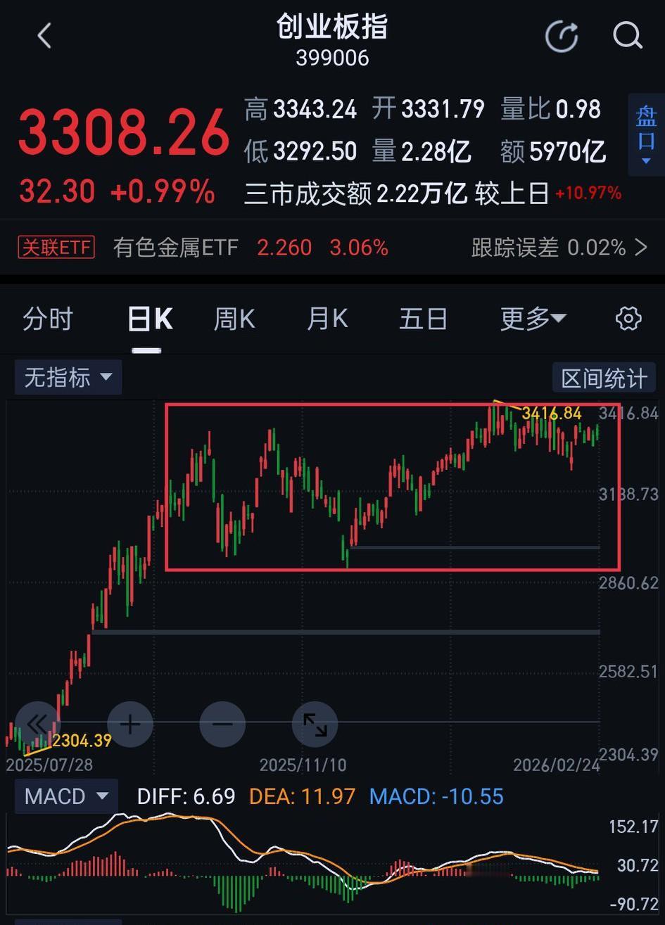 创业板,周三将迎来短周期变盘窗口。明天能否有效站稳3284是关键。站稳,后期将有望形成图〈1〉五分钟中枢的向上离开段,创业板后期将有机会去挑战3416的高点,后续走势结构要观察是否围绕该中枢形成盘整背驰。如果不能有效站稳,只要不出现快速跌破3275的走势,暂可用五分钟中枢震荡的视角观察。如果快速跌破3275,则要防止反抽形成对该中枢的三卖。如果三卖形成,不排除后期创业板向图〈2〉箱体下沿附近寻求支撑的可能。图〈1〉黄色箭头属于未完成走势。