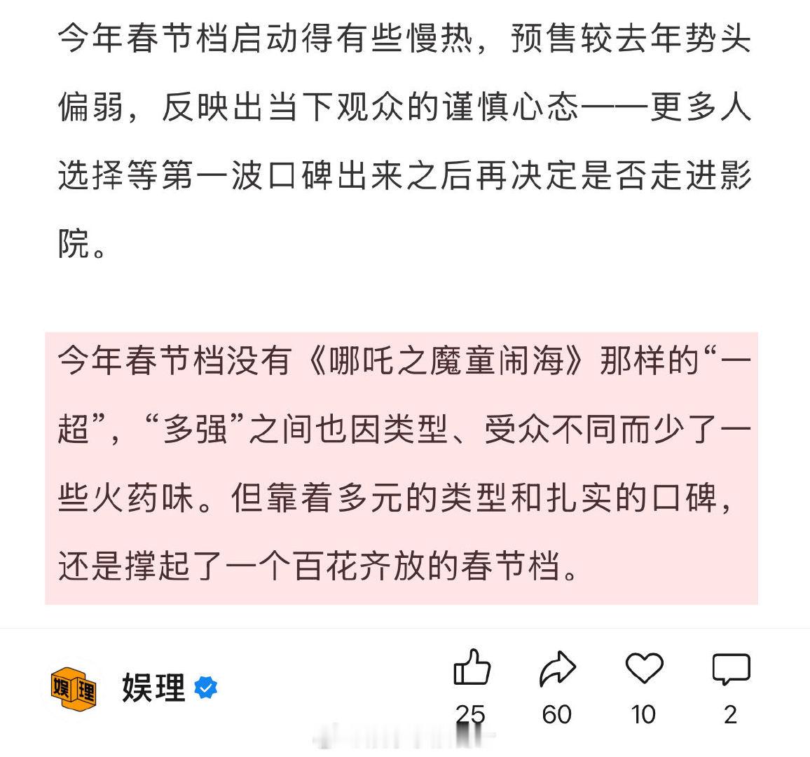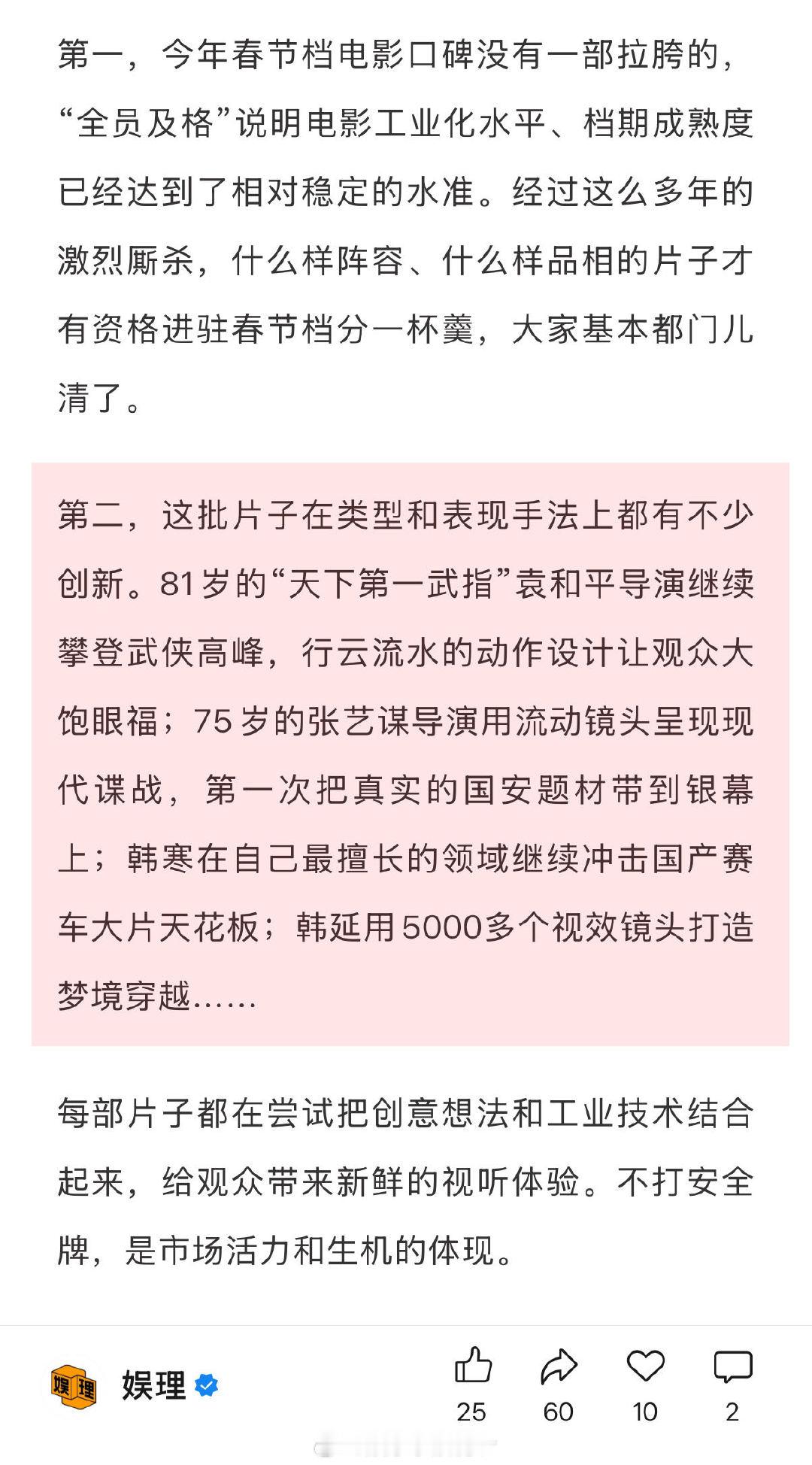 春节档爆款可遇不可求 镖人成春节档最大黑马 今年的春节档电影在类型和表现手法上都有不少创新。81岁的“天下第一武指”袁和平导演继续攀登武侠高峰;75岁的张艺谋导演第一次把真实的国安题材带到银幕上;韩寒在自己最擅长的领域继续冲击国产赛车大片天花板;韩延用5000多个视效镜头打造梦境穿越…娱理独家↓