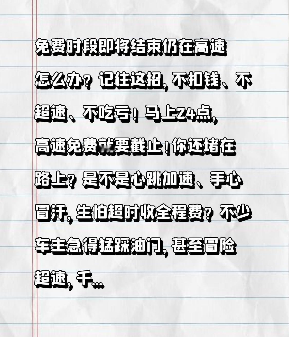免费时段即将结束仍在高速怎么办?记住这招,不扣钱、不超速、不吃亏! 马上24点,高速免费就要截止!你还堵在路上?是不是心跳加速、手心冒汗,生怕超时收全程费?不少车主急得猛踩油门,甚至冒险超速,千万别这么干!今天教你一招,合法省钱又安全。 很多车主都搞错一个关键:高速免费只看下高速时间,不看你上高速时间!只要24点前驶出收费站,前面跑多远都免费;一旦超时,直接收全程费用,几百上千块就没了。 眼看时间快到,你离目的地还远,最忌讳的就是“卡点冲刺”。每年都有人差几分钟没下来,白白多花几百块,更怕为了赶时间引发事故,得不偿失。 重点来了!转折点就是这个官方操作,记住就能稳省一笔钱。 不用硬撑到终点,立刻找最近的收费站先下高速!只要在免费时间内驶出,前面路段全部免费。下高速后,马上再重新上高速,后面路段重新计费,只收一小段钱,几乎等于白跑全程。 这不是投机取巧,是交通运输部、交警官方明确推荐的合法省钱办法,既不违规,又能避免超速危险,简单好用,谁学谁赚。 总有人为了省几十块钱抢秒数,拿自己和家人的安全冒险。可我们跑高速,求的是平安,不是赌那一分钟。 免费是福利,安全才是底线。钱能省,命不能赌;路再长,平安到家比什么都强。 记住:就近下道,免费到手;重新上路,只收小头。别卡点、别超速、别慌神,按规矩来,既省钱又安心。 愿每一位返程车主,一路畅通,平安到家,不花冤枉钱,不上冤枉险!