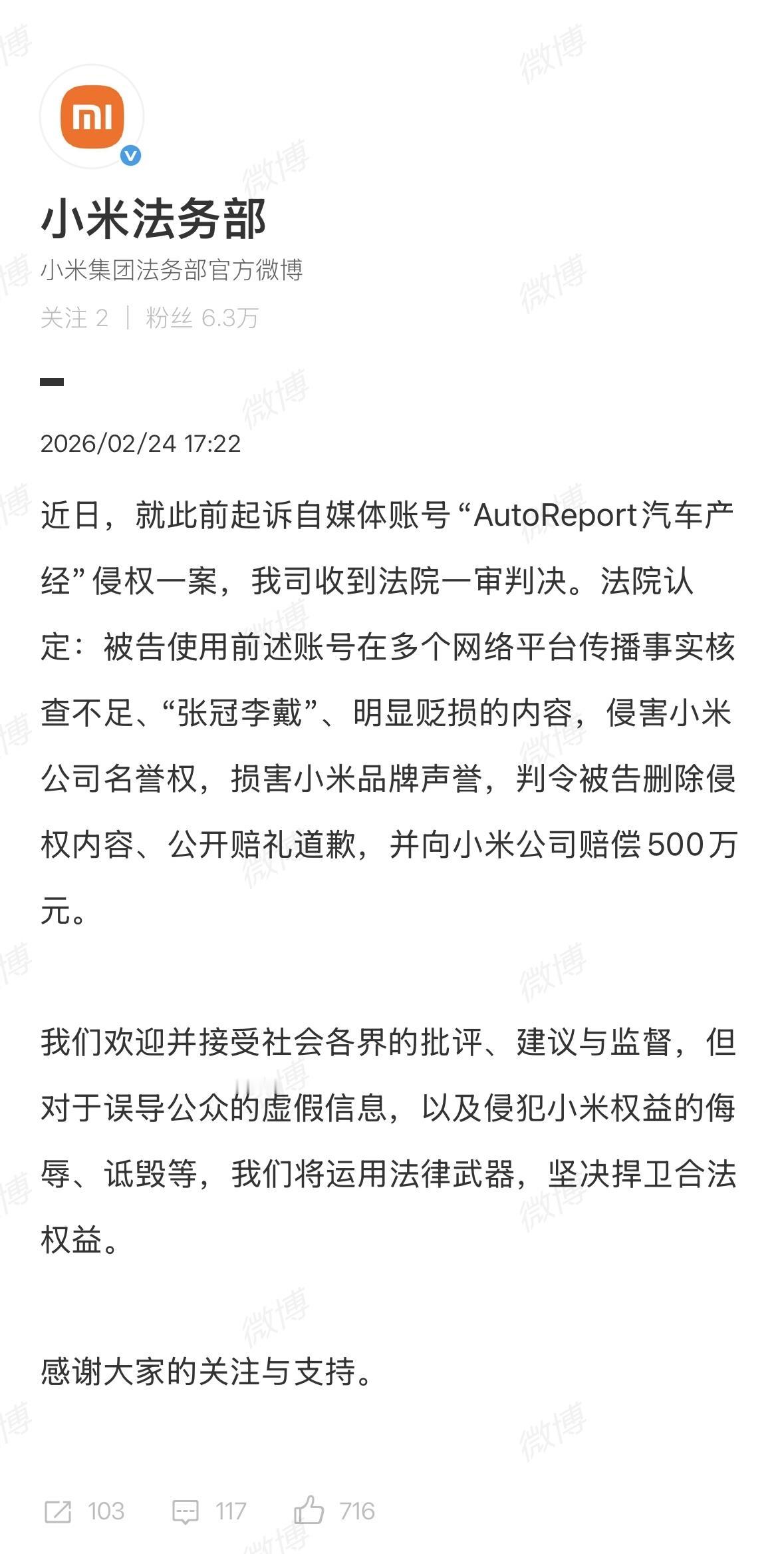 赛车星冰乐被判向尊界汽车赔偿30万元 AutoReport汽车产经被判向小米公司赔偿500万元