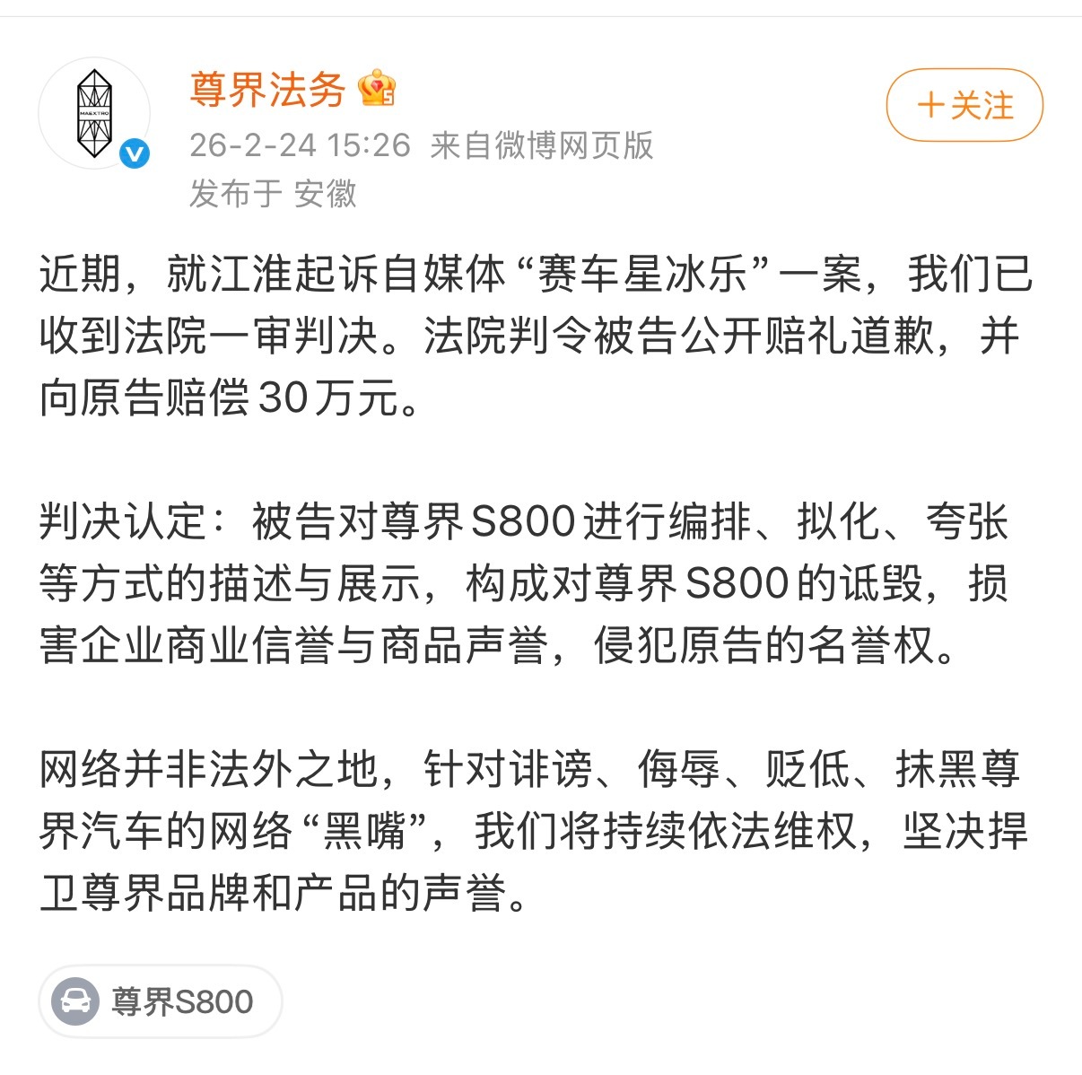 年后第一瓜,赛车星冰乐也判了,公开赔礼道歉,并赔偿原告30万!