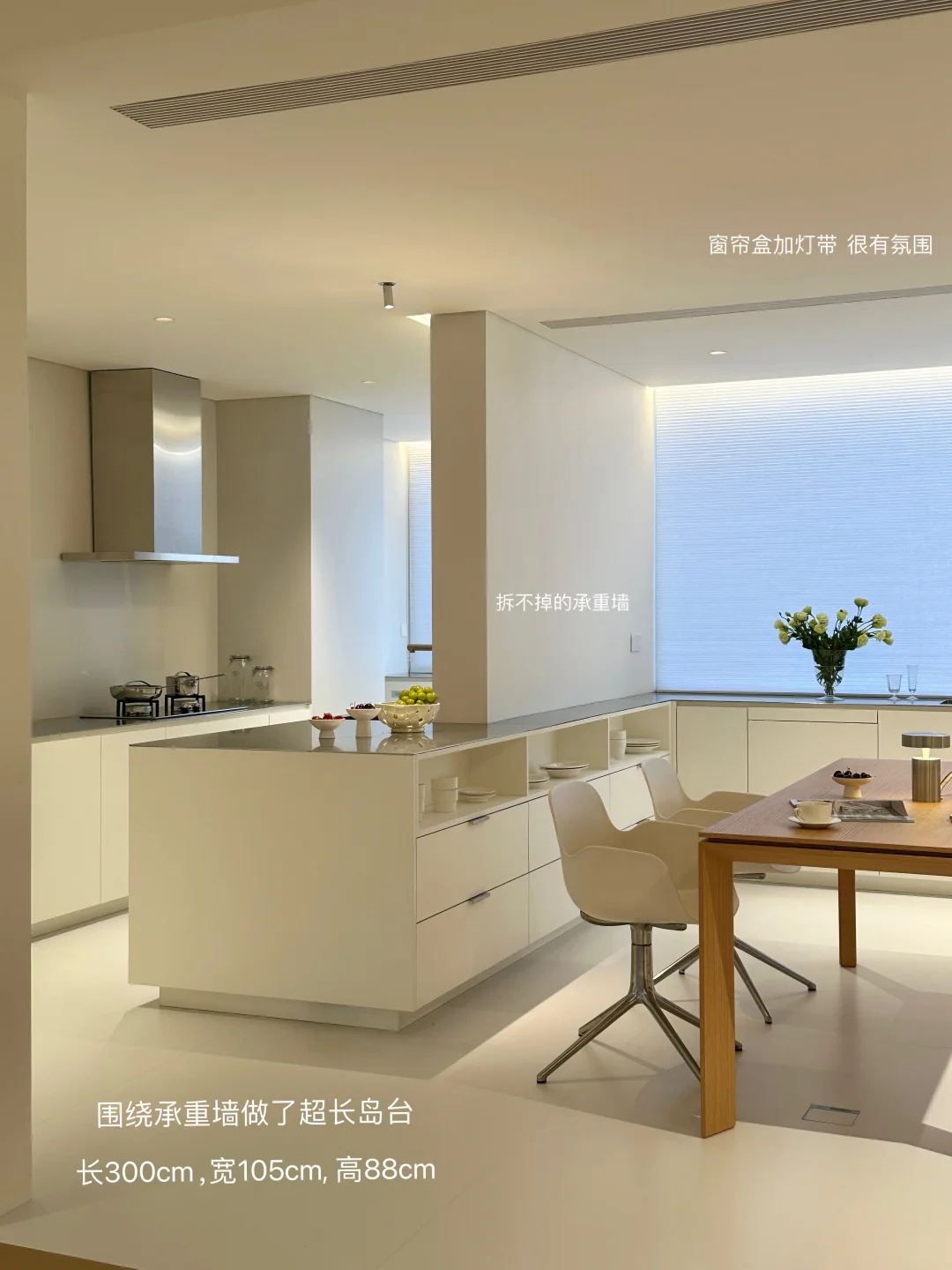 围绕承重墙定制3米超长岛台,下方做开放式格,常用餐具随手拿取,既是收纳区也是展示区✨