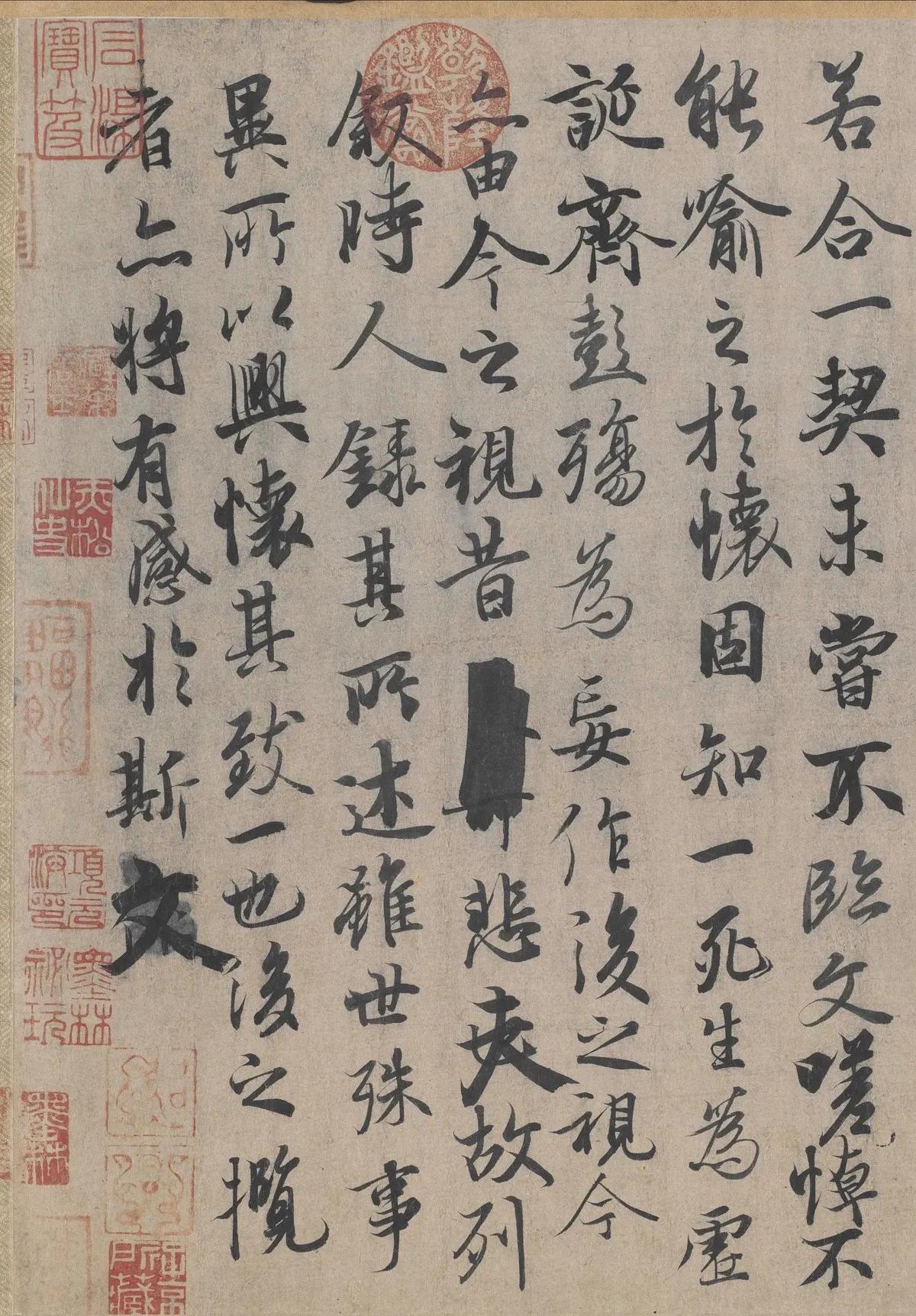 《兰亭序》 ——晋·王羲之 永和九年,岁在癸丑,暮春之初,会于会稽山阴之兰亭,修禊事也。群贤毕至,少长咸集。此地有崇山峻岭,茂林修竹,又有清流激湍,映带左右,引以为流觞曲水,列坐其次。虽无丝竹管弦之盛,一觞一咏,亦足以畅叙幽情。 是日也,天朗气清,惠风和畅。仰观宇宙之大,俯察品类之盛,所以游目骋怀,足以极视听之娱,信可乐也。 夫人之相与,俯仰一世。或取诸怀抱,悟言一室之内;或因寄所托,放浪形骸之外。虽趣舍万殊,静躁不同,当其欣于所遇,暂得于己,快然自足,不知老之将至;及其所之既倦,情随事迁,感慨系之矣。向之所欣,俯仰之间,已为陈迹,犹不能不以之兴怀,况修短随化,终期于尽!古人云:“死生亦大矣。”岂不痛哉! 每览昔人兴感之由,若合一契,未尝不临文嗟悼,不能喻之于怀。固知一死生为虚诞,齐彭殇为妄作。后之视今,亦犹今之视昔,悲夫!故列叙时人,录其所述,虽世殊事异,所以兴怀,其致一也。后之览者,亦将有感于斯文。