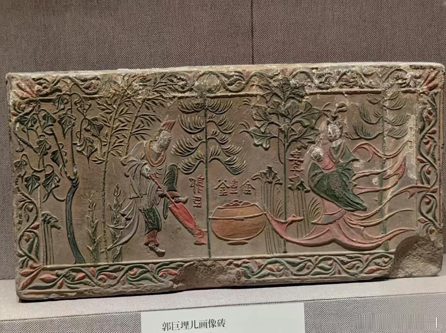 河南邓州学庄村南朝墓葬出土的“郭巨埋儿”画像砖,是南北朝时期孝子题材绘画的代表性实物。画面为阴线刻,构图简洁:左侧郭巨执锹掘坑,右侧其妻怀抱幼儿,上方从天而降的一釜黄金点明故事结局。其艺术风格兼具南朝秀骨清像的人物特征与民间绘画的质朴气息。“郭巨埋儿”故事出自《二十四孝》。相传汉代郭巨家贫,为奉养母亲,决定埋掉幼子以节省口粮。掘地时感动天地,得黄金一釜,并有“天赐郭巨,官不得取,民不得夺”字样。该故事在古代被奉为孝道极端典范,但在现代视角下,其违背人性的伦理观常受批判。该画像砖的出土,反映了南朝时期“孝”作为核心伦理已深入丧葬文化,成为墓葬装饰的固定主题。其图像叙事清晰,是研究南北朝绘画艺术、社会思想及孝道观念传播的重要实物资料。原件现藏于河南博物院。考古知识历史文物古墓历史文化历史人物