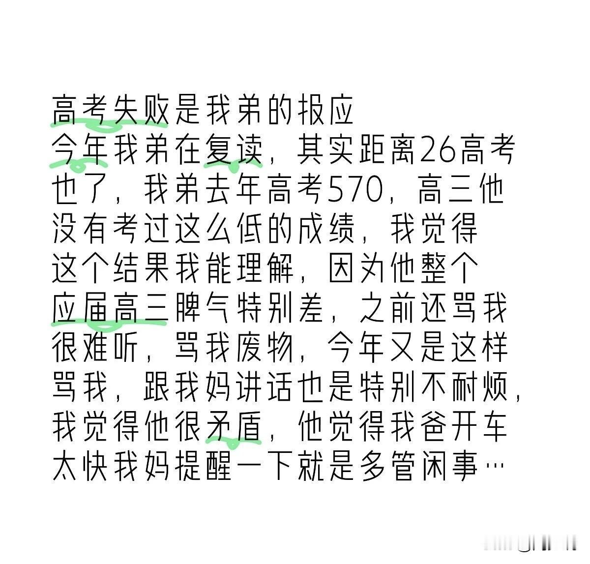 “高考考不好,是他应得的!”江西一位姐姐的心里话,看得人五味杂陈。她的弟弟正在备战高考,平时成绩稳居全校前十,本该是全家的骄傲。可姐姐却说,就算今年考不好,她一点也不意外。 高三这两年,弟弟脾气越来越差。对姐姐张口就骂“废物”,对妈妈也是满脸不耐烦。家人好心提醒爸爸开车慢一点,注意安全,他都觉得是多管闲事,甚至怼道:“你们没驾照,凭什么指挥人?” 敏感、暴躁、不懂尊重,在他身上表现得格外明显。姐姐也曾真心盼着弟弟前程似锦,可这个寒假,她彻底寒了心。 此话一出,众多网友纷纷表示:“成绩再好,不懂得尊重家人,路也走不远。情商和教养,有时候真比分数重要得多”。 在周少看来,其实很多人都没意识到,性格里的刺,早晚也会扎到自己。分数能决定孩子能进哪所大学,可教养和脾气,往往会影响他的一生到底能走多远。 客观的说,一味沉浸在自己的世界里,把最差的情绪留给最亲的人,就算暂时成绩亮眼,将来也难免栽跟头。 其实,真正拉开差距的,从来不只是分数。懂得尊重他人、控制情绪、心怀感恩,这些看似和学习无关的品质,往往才是人生路上最稳的底气。希望这位弟弟,能早一点明白这个道理吧。#寻美三湘# #周少说教育#