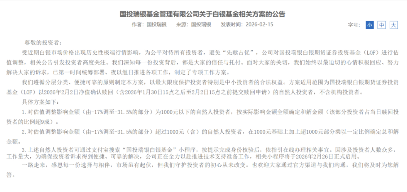 2月15日,也即除夕前一天,国投瑞银基金管理有限公司在官网发布关于白银基金相关方案的公告。根据相关方案,对估值调整影响金额(由-17%调至-31.5%的部分)为1000元以下的自然人投资者,按实际影响金额全额确定和解金额(该部分投资者占当日赎回投资者的比例超九成)。