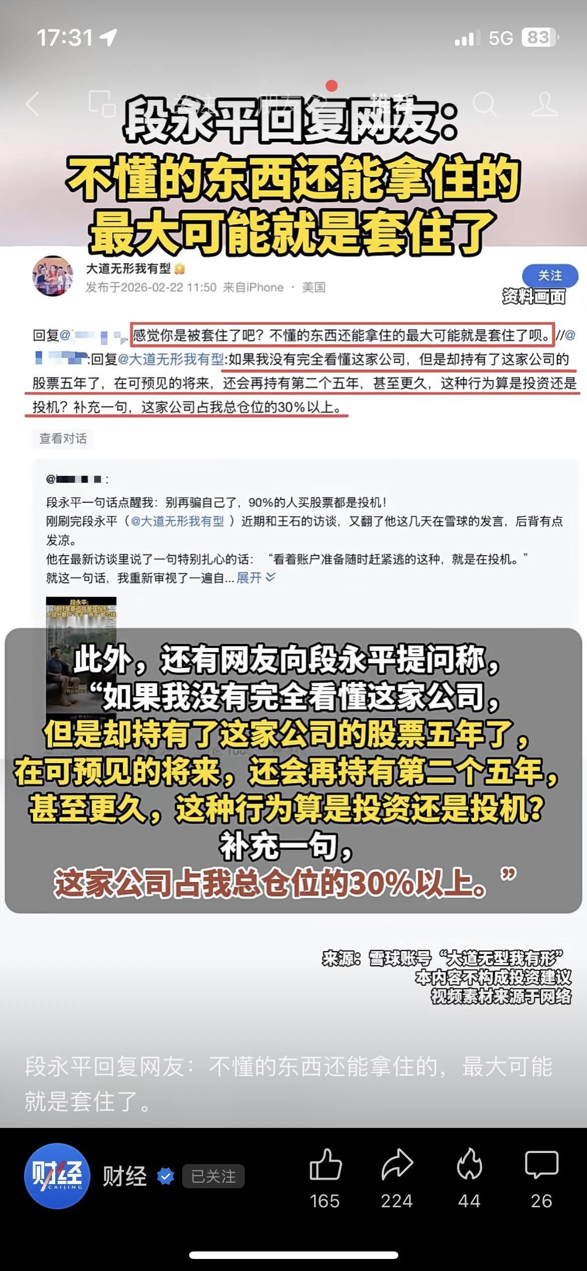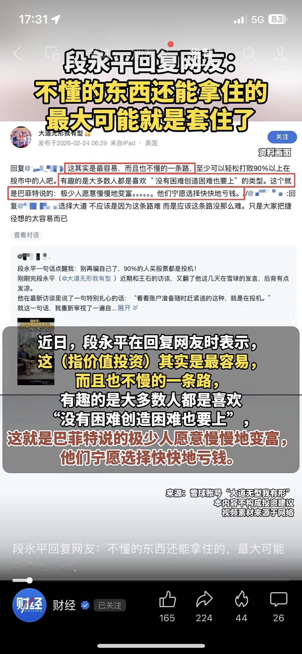 段永平又在雪球说大实话,一句话戳醒无数股民。 有网友问:我没看懂这家公司,却拿了5年,仓位30%以上,这算投资还是投机? 段永平直接回:感觉你是被套住了吧?不懂的东西还能拿住,最大可能就是被套住了。 他还补了一句更扎心的:大多数人都喜欢“没有困难创造困难也要上”,极少有人愿意慢慢变富,他们宁愿选择快快地亏钱。 这话真的太真实了。 很多人嘴里的“价值投资”,其实就是套牢后的自我安慰。 真看懂的人,拿得淡定;看不懂硬拿,基本都是被动扛单。 咱普通人炒股,别给自己加戏。 先问自己一句:这家公司靠什么赚钱?逻辑你真的看懂了吗? 看不懂还重仓,那不叫投资,叫赌运气。 段永平 价值投资 炒股心态 市场有风险,投资需谨慎,本文不构成任何投资建议。