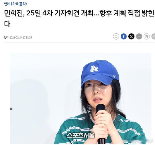 闵熙珍将召开第四次记者会闵熙珍将再开记者会据韩媒,闵熙珍将于明天再次举办记者发布会,亲自回应与HYBE一审胜诉及后续计划。