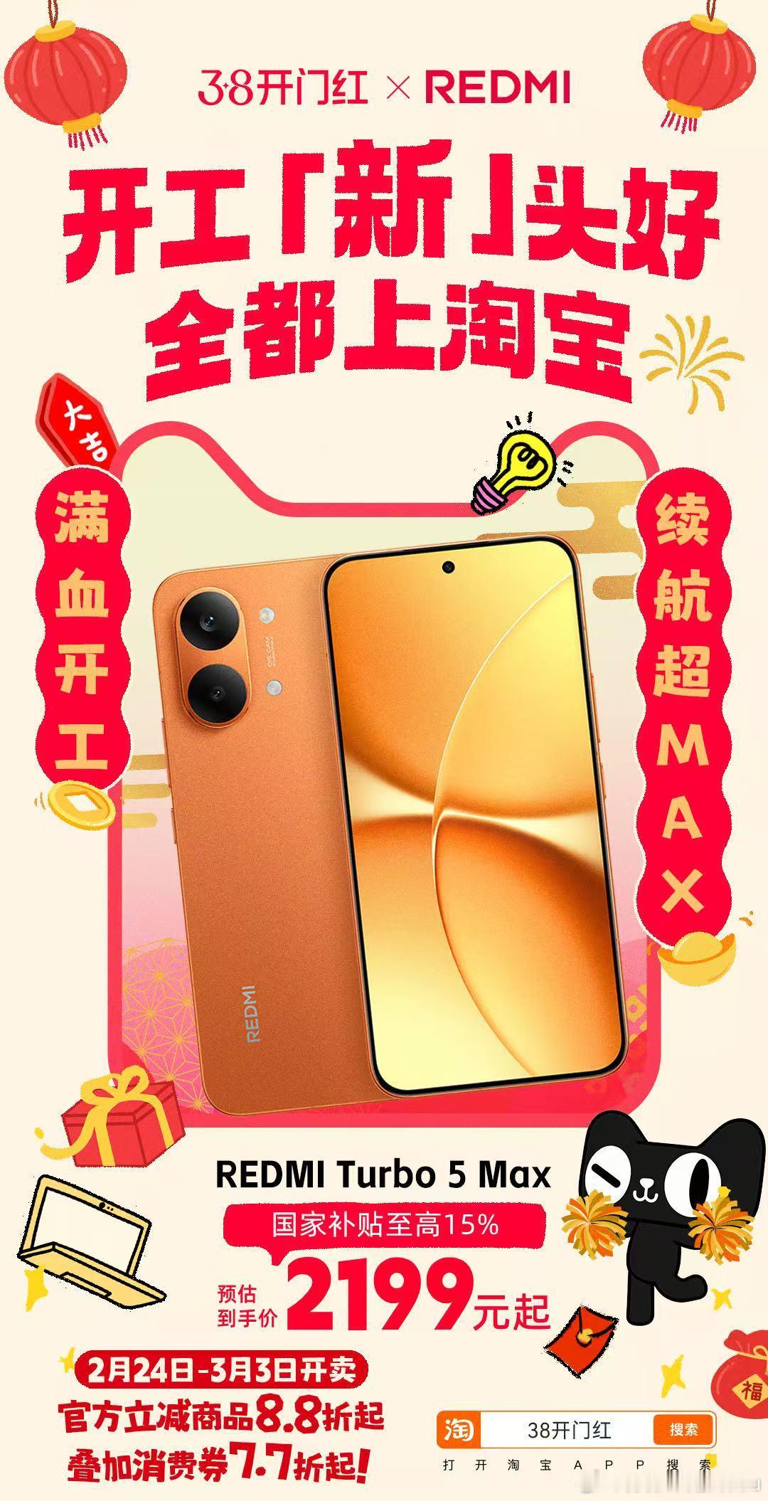 上淘宝开工淘个好彩头 开工大吉淘好彩头!红米数码好物性能在线、性价比拉满,复工效率直接翻倍。天猫搜【38开门红】8.8折起,叠券7.7折起,上淘宝开工焕新超划算~开工新头好全都上淘宝
